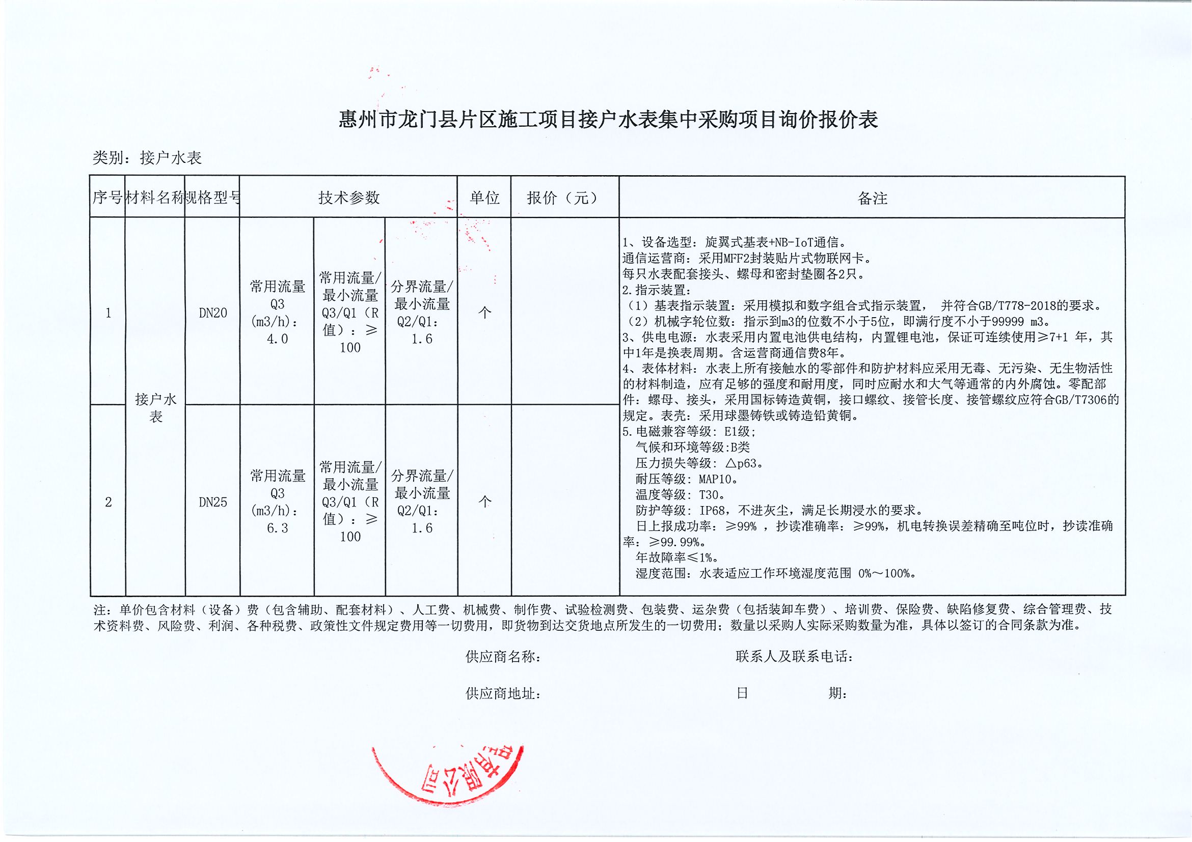 惠州市龍門(mén)縣片區(qū)施工項(xiàng)目接戶(hù)水表集中采購(gòu)項(xiàng)目詢(xún)價(jià)公告