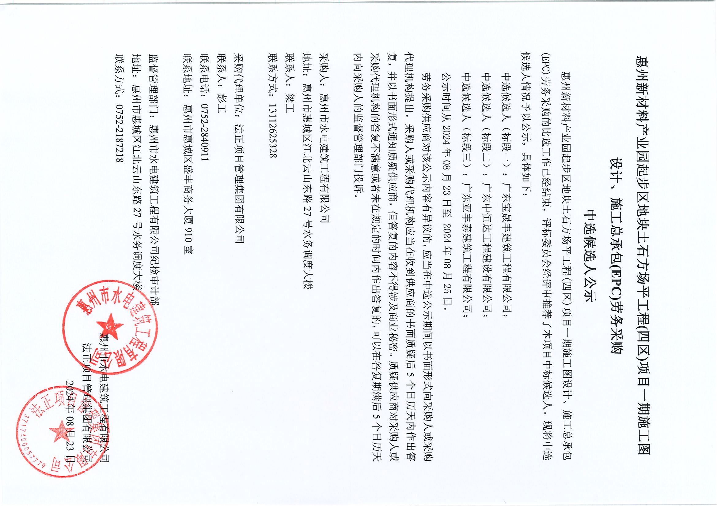 惠州新材料產(chǎn)業(yè)園起步區(qū)地塊土石方場平工程(四區(qū))項(xiàng)目一期施工圖設(shè)計(jì)、施工總承包(EPC)勞務(wù)采購中選候選人公示