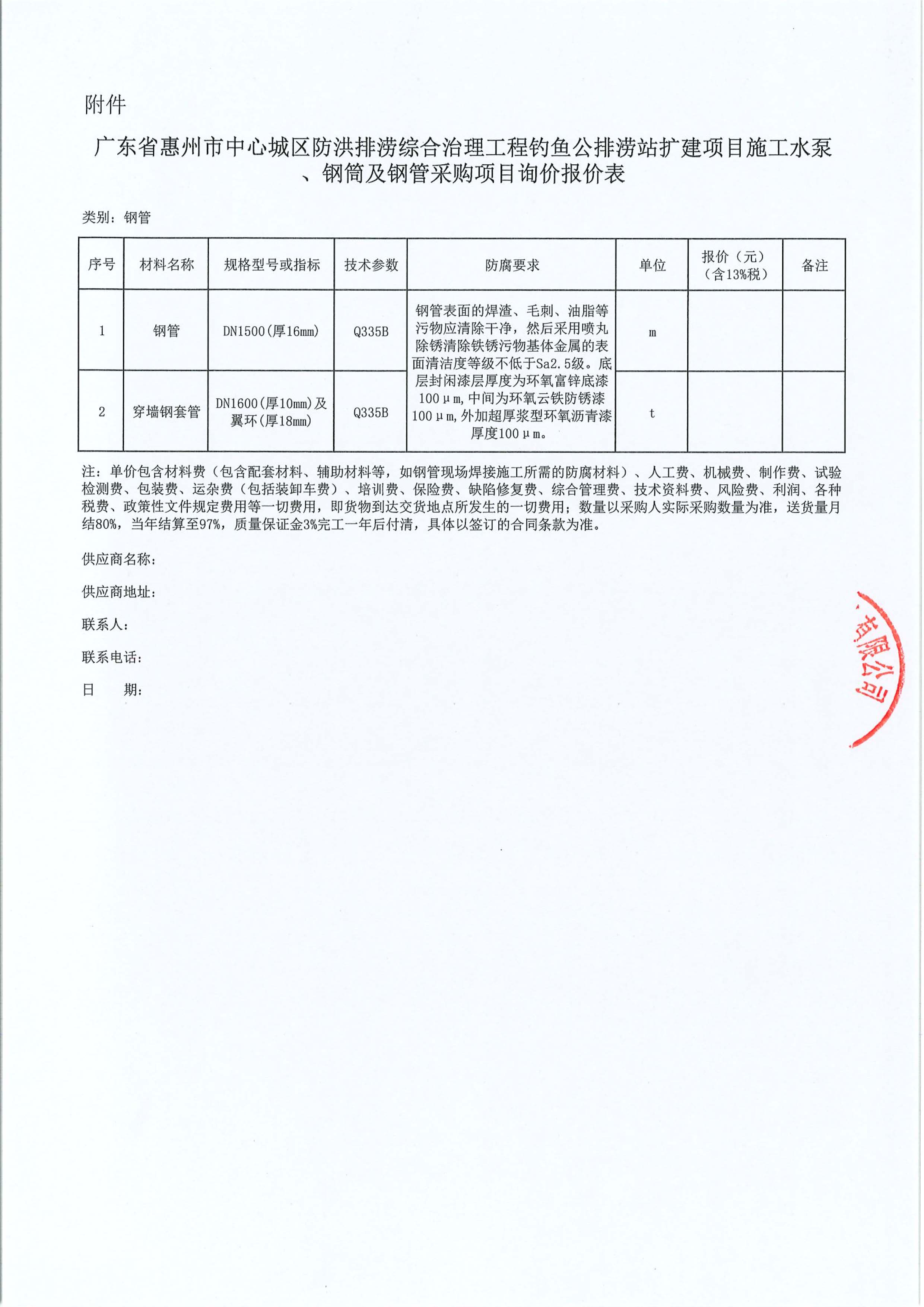 廣東省惠州市中心城區(qū)防洪排澇綜合治理工程釣魚公排澇站擴建項目施工水泵、鋼筒及鋼管采購項目詢價公告附件: