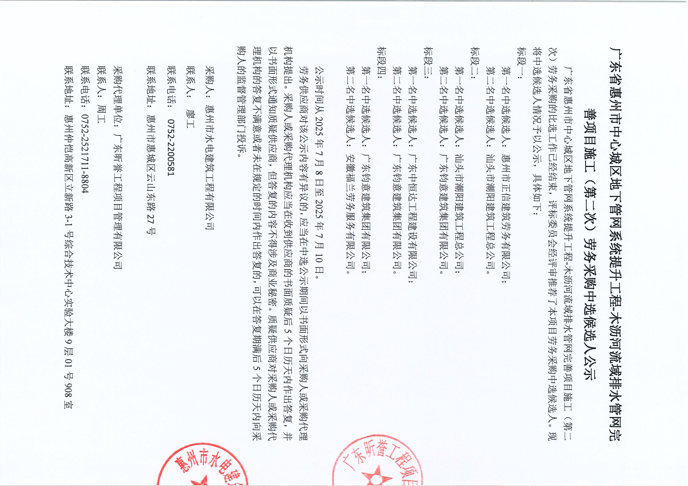 廣東省惠州市中心城區(qū)地下管網(wǎng)系統(tǒng)提升工程-木瀝河流域排水管網(wǎng)完善項目施工(第二次)勞務(wù)采購中選候選人公示