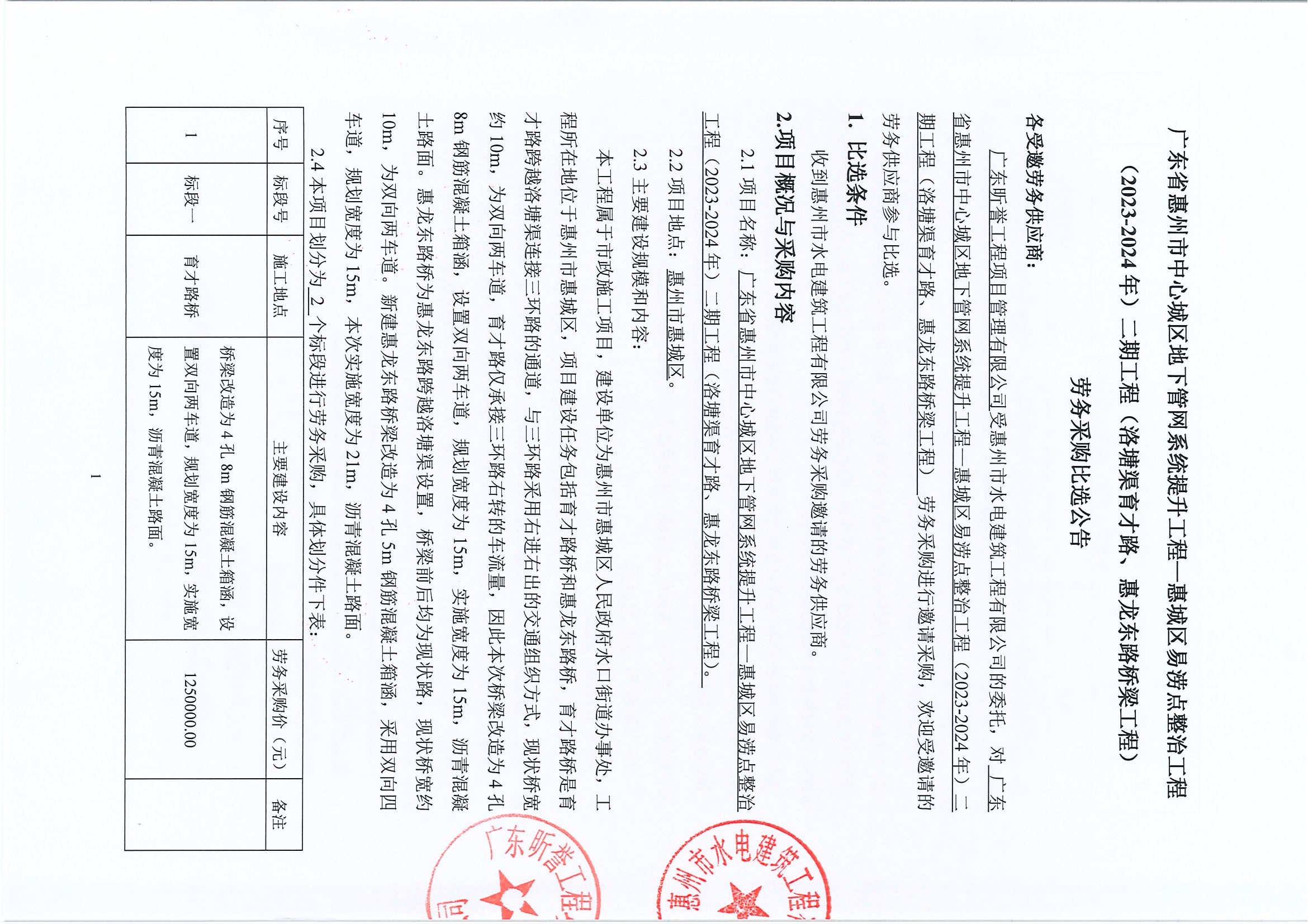 廣東省惠州市中心城區(qū)地下管網(wǎng)系統(tǒng)提升工程—惠城區(qū)易澇點(diǎn)整治工程(2023-2024年)二期工程(洛塘渠育才路、惠龍東路橋梁工程) 勞務(wù)采購(gòu)比選公告