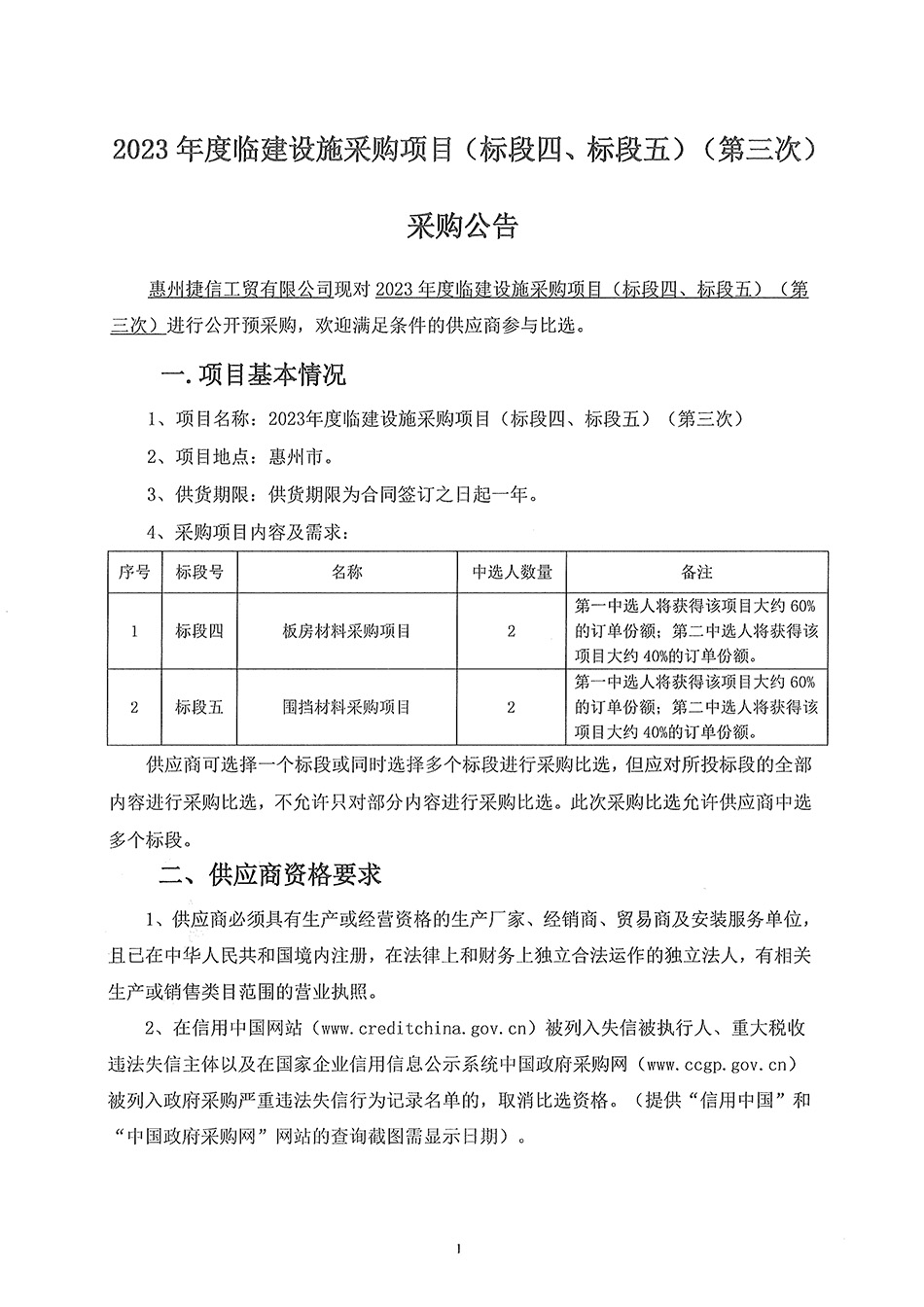 捷信工貿(mào)公司2023年度臨建設(shè)施采購項目(第三次)采購公告