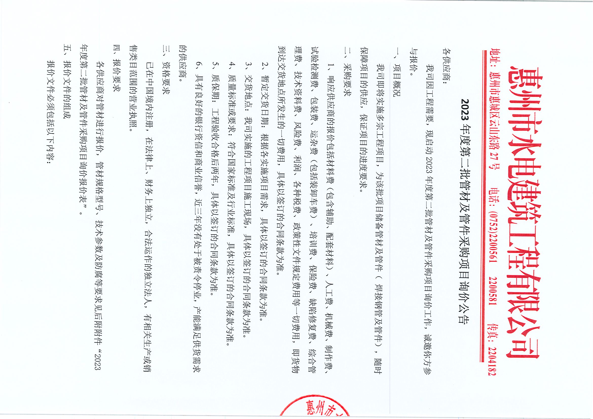 2023年度第二批管材及管件采購(gòu)項(xiàng)目詢(xún)價(jià)公告
