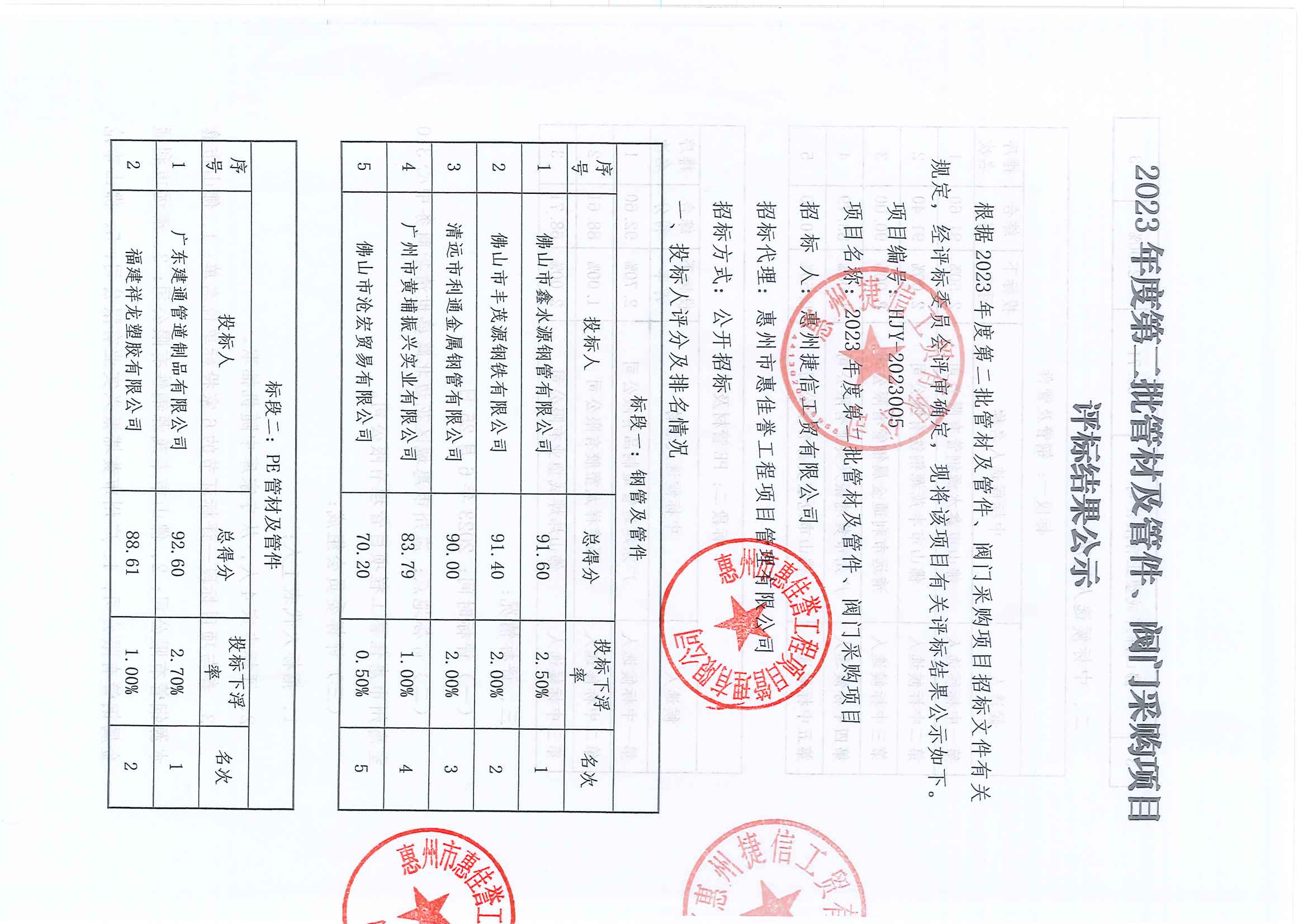 捷信工貿(mào)公司2023年度第二批管材及管件、閥門采購項目評標(biāo)結(jié)果公示