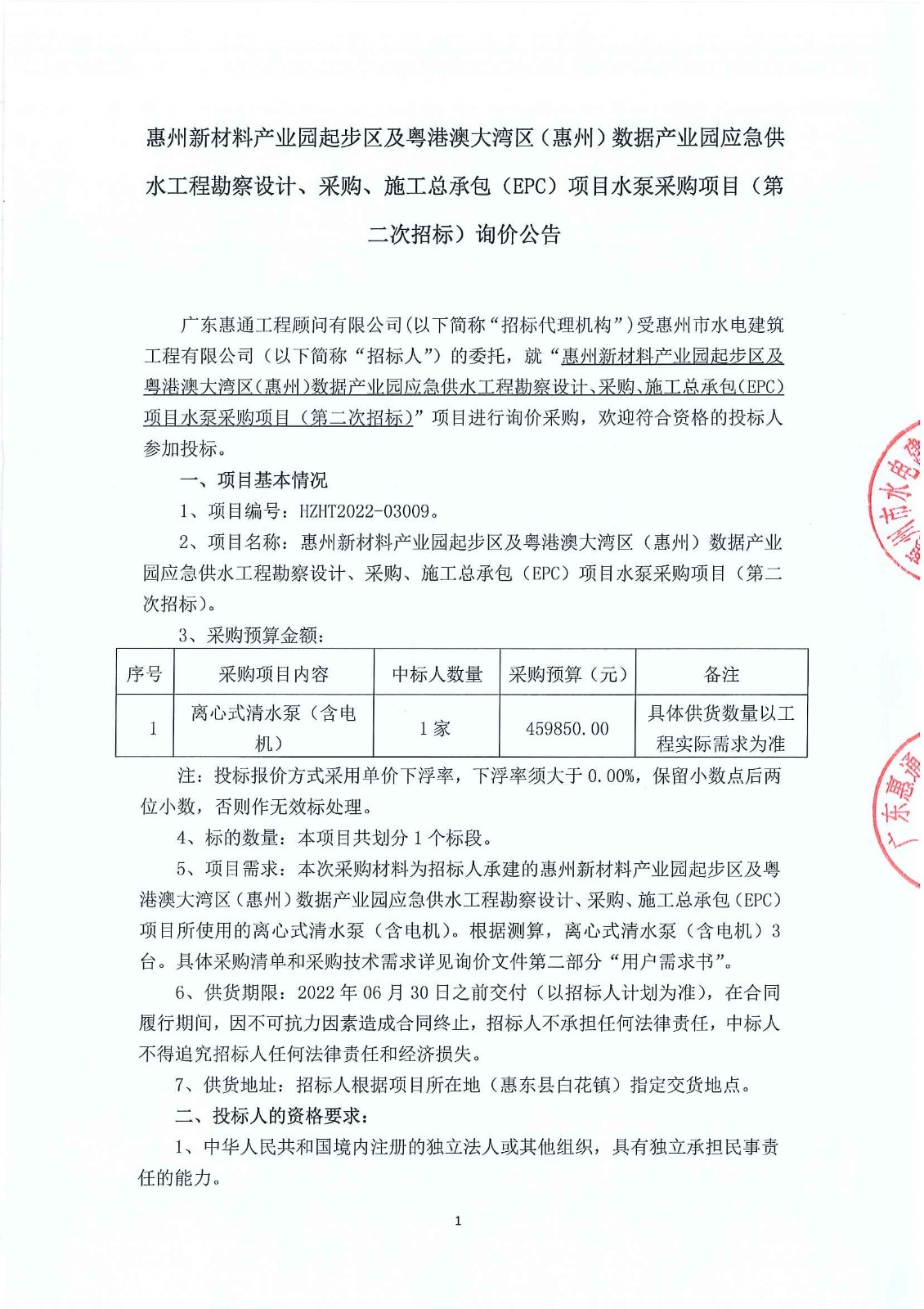 附件1:惠州新材料產(chǎn)業(yè)園起步區(qū)及粵港澳大灣區(qū)(惠州)數(shù)據(jù)產(chǎn)業(yè)園應急供水工程勘察設計、采購、施工總承包(EPC)項目水泵采購項目(第二次招標)詢價文件附件2:領取詢價文件登記表......