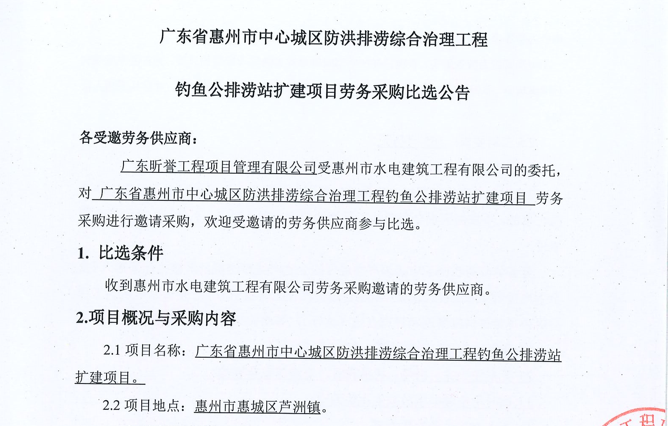 廣東省惠州市中心城區(qū)防洪排澇綜合治理工程釣魚公排澇站擴(kuò)建項(xiàng)目勞務(wù)采購比選公告......
