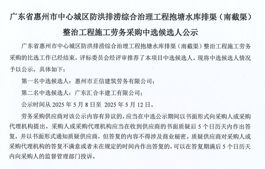 廣東省惠州市中心城區(qū)防洪排澇綜合治理工程抱塘水庫排渠(南截渠)整治工程施工勞務(wù)采購中選候選人公示......