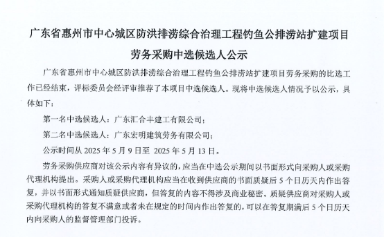 廣東省惠州市中心城區(qū)防洪排澇綜合治理工程釣魚公排澇站擴(kuò)建項(xiàng)目勞務(wù)采購中選候選人公示......