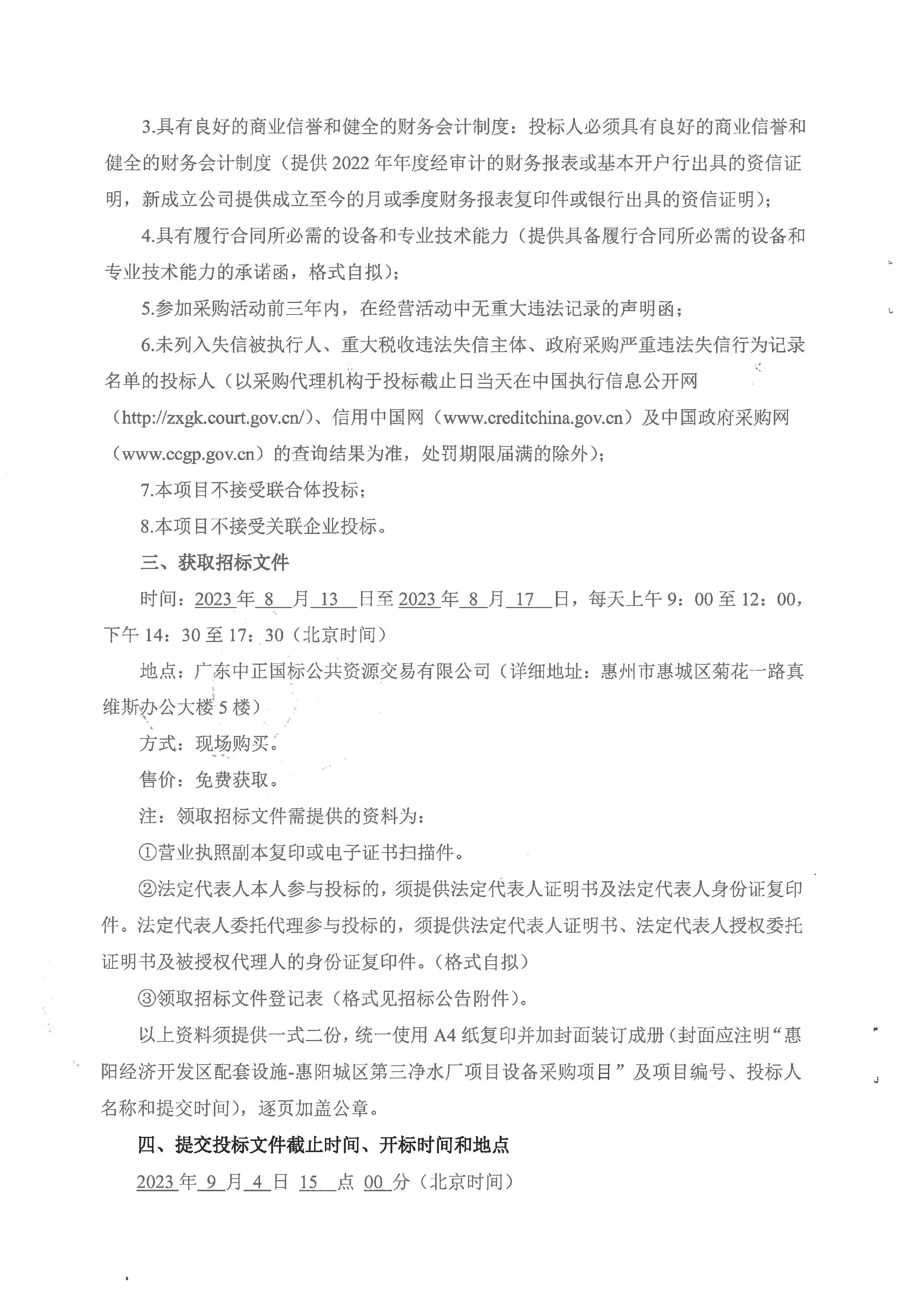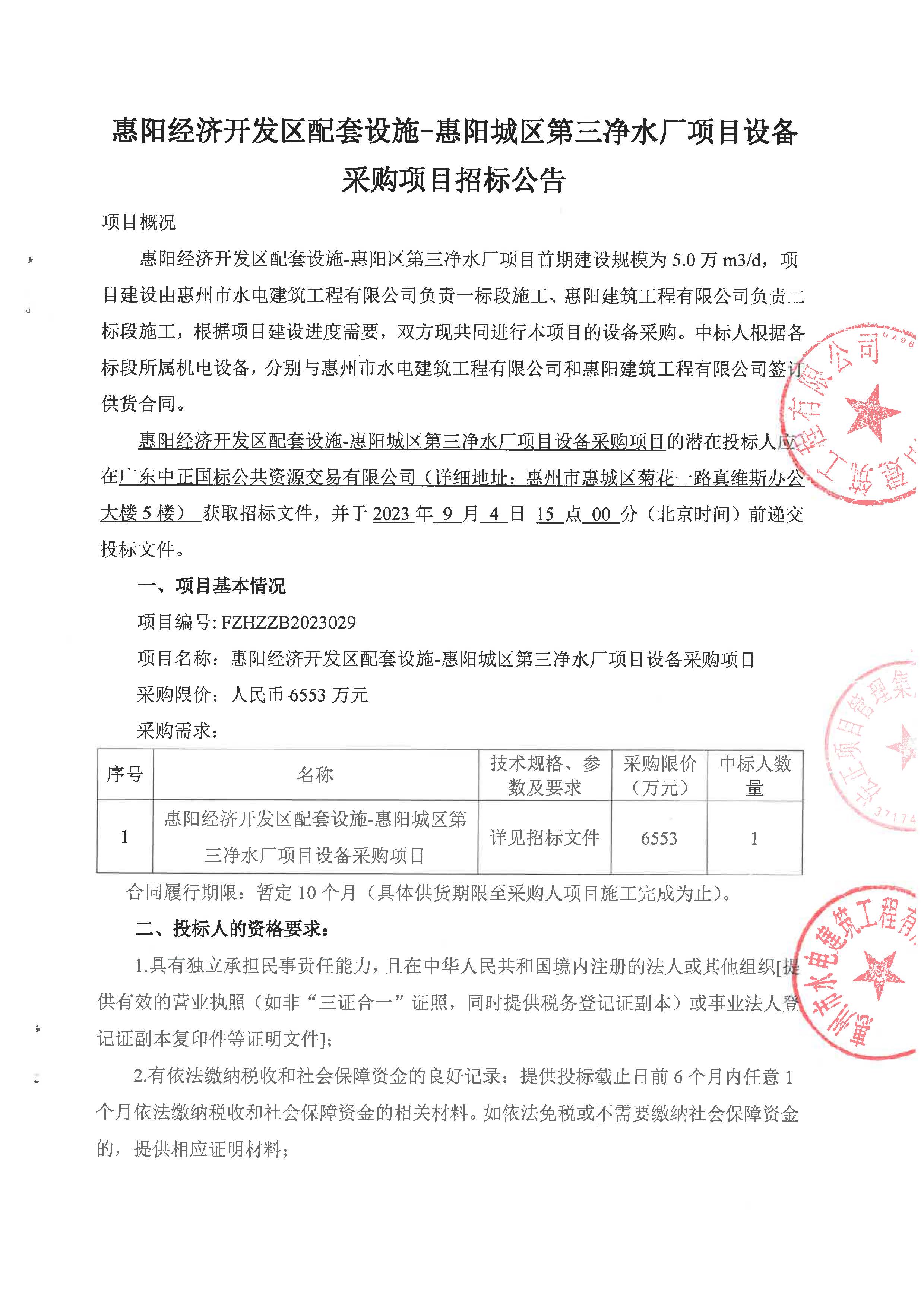 惠陽經(jīng)濟開發(fā)區(qū)配套設(shè)施-惠陽城區(qū)第三凈水廠項目設(shè)備采購項目招標公告
