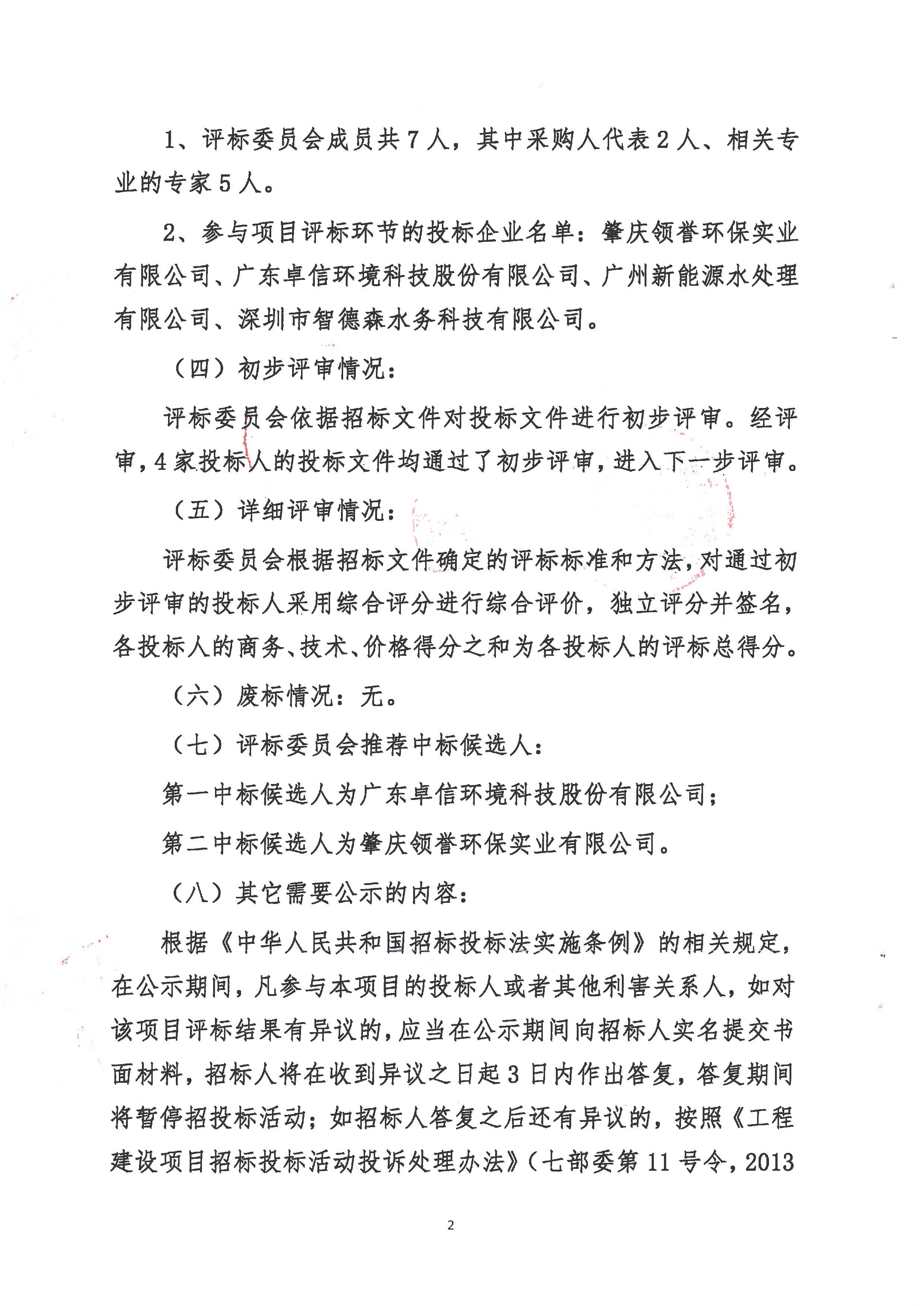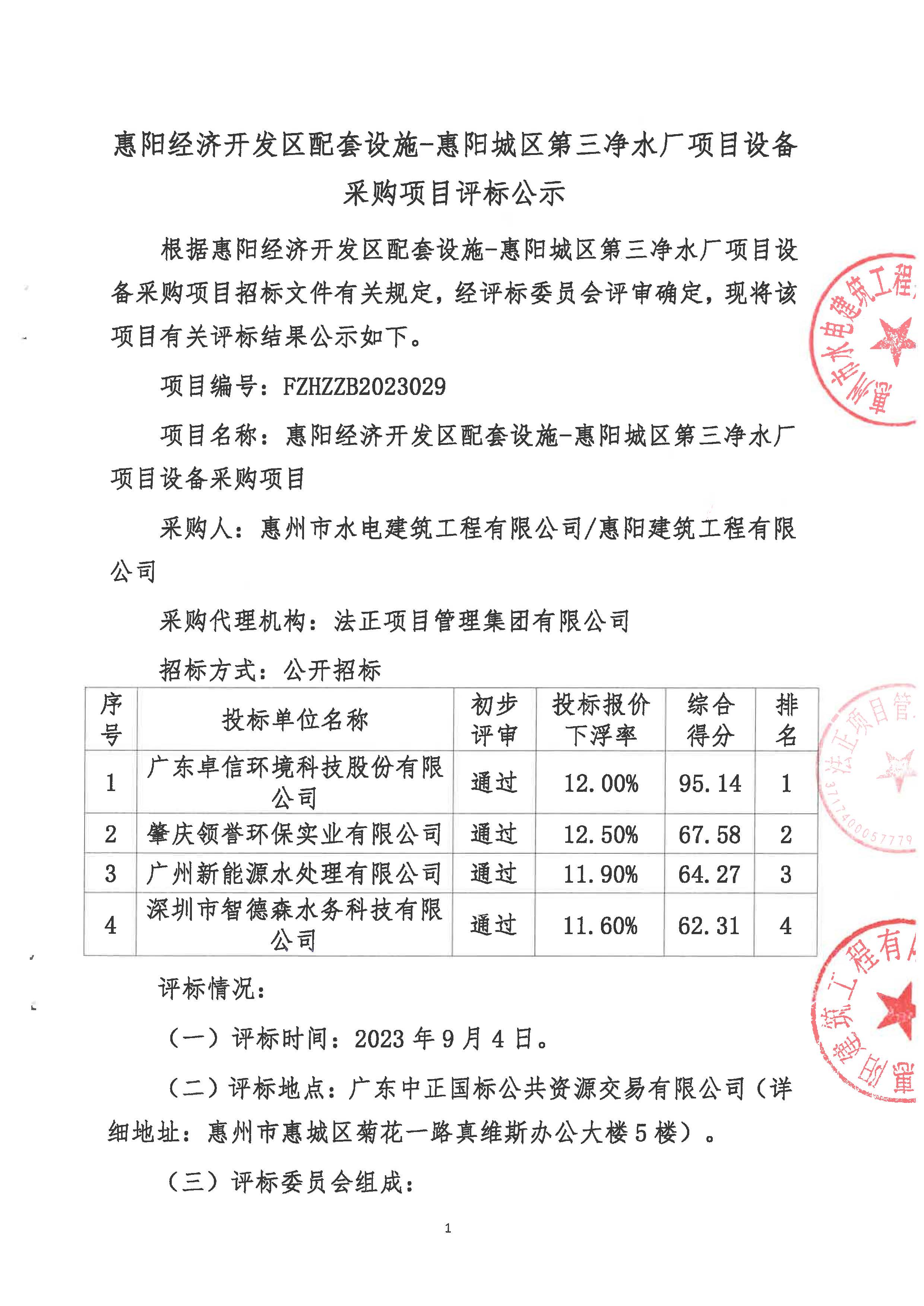 惠陽經(jīng)濟開發(fā)區(qū)配套設(shè)施——惠陽城區(qū)第三凈水廠項目設(shè)備采購項目評標(biāo)公示