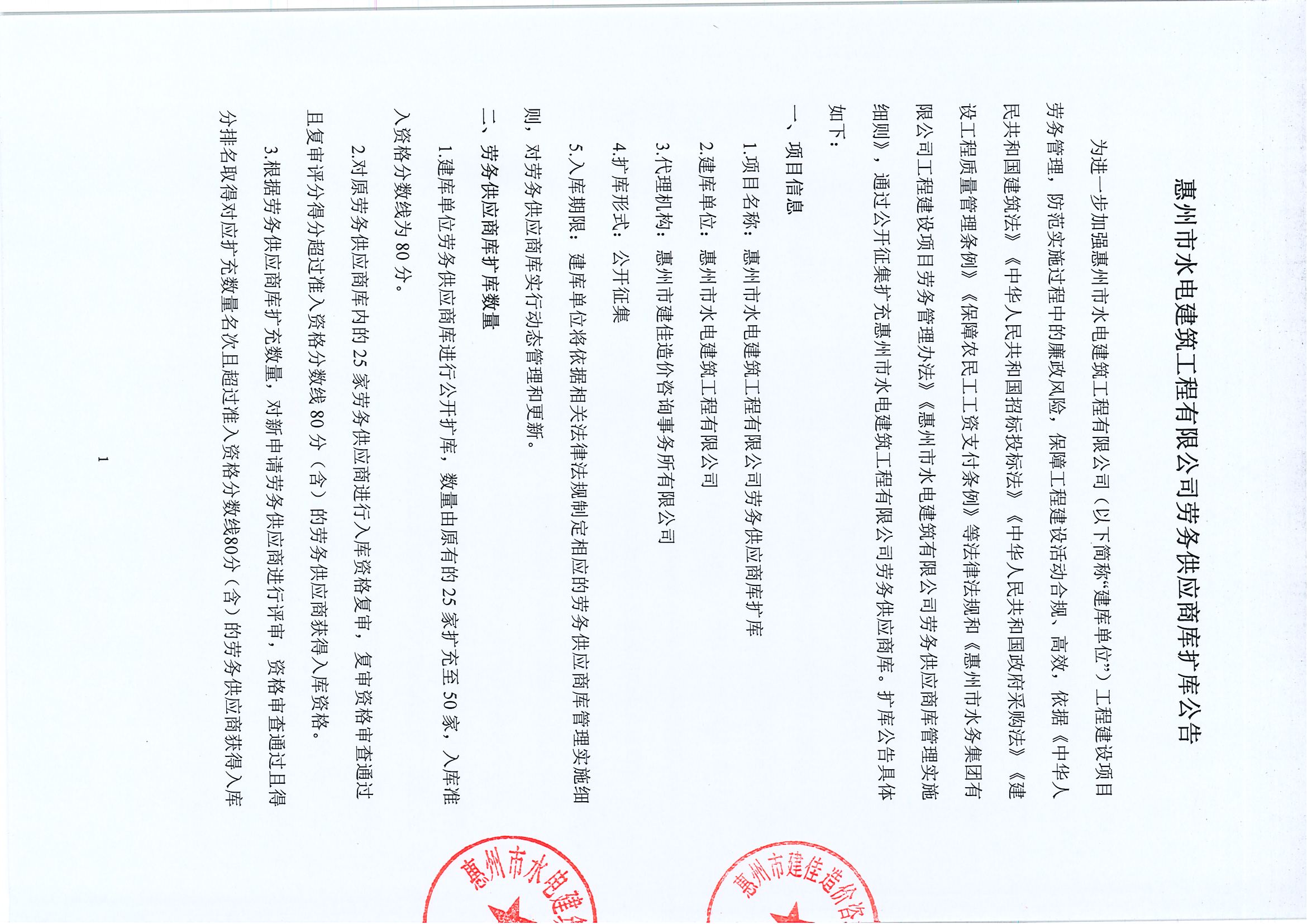 惠州市水電建筑工程有限公司勞務(wù)供應(yīng)商庫擴庫公告文件: