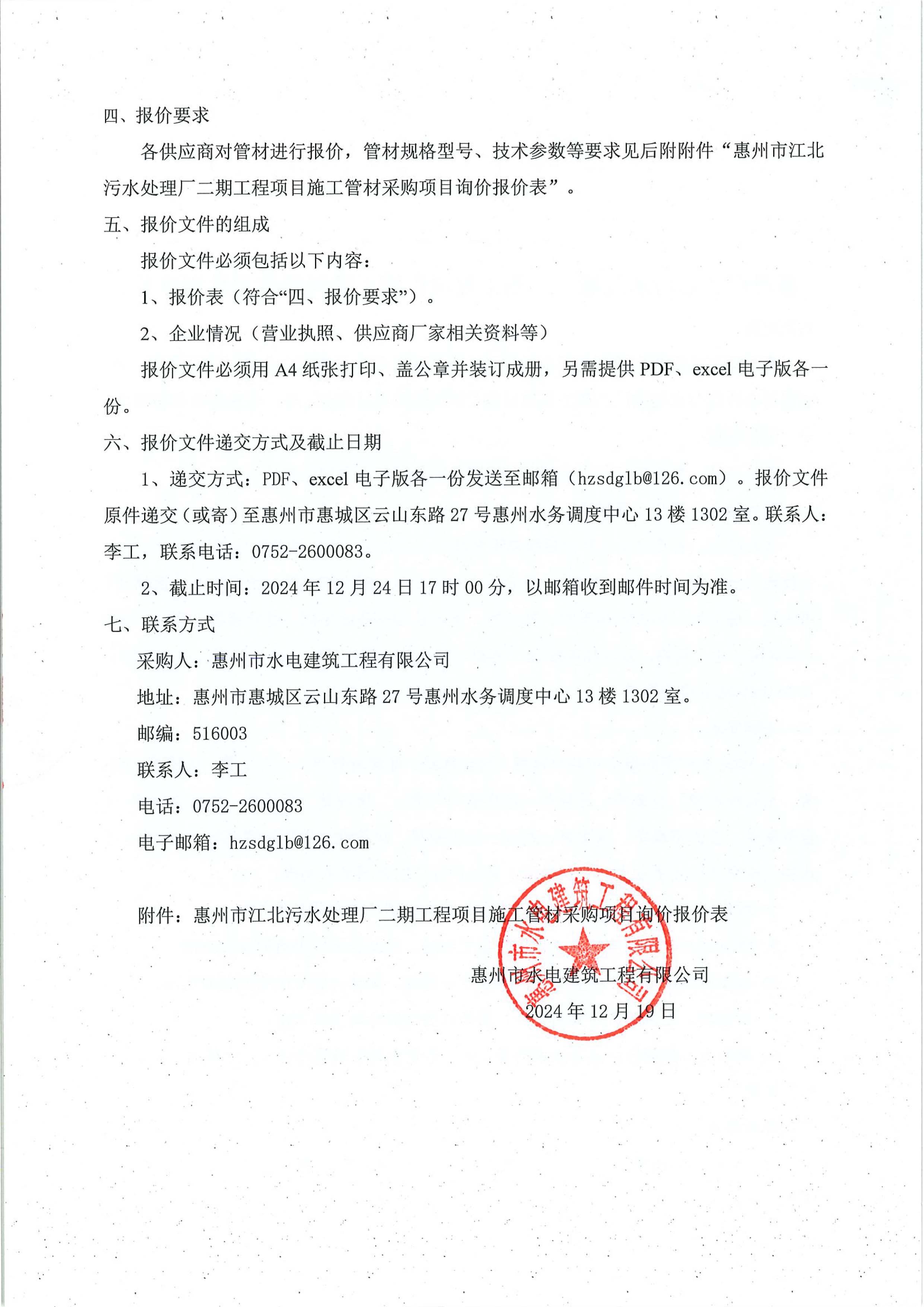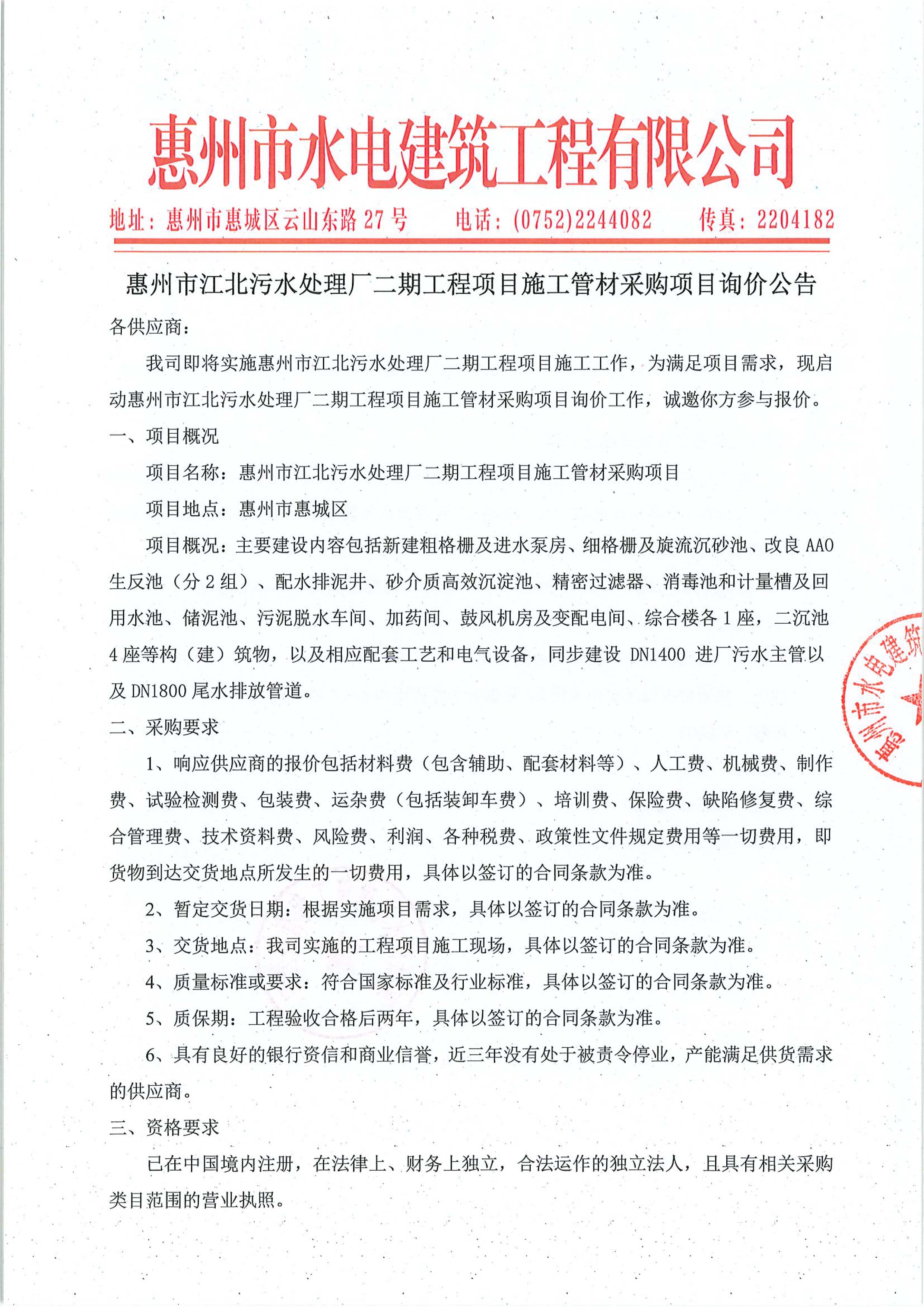 惠州市江北污水處理廠二期工程項(xiàng)目施工管材采購項(xiàng)目詢價(jià)公告