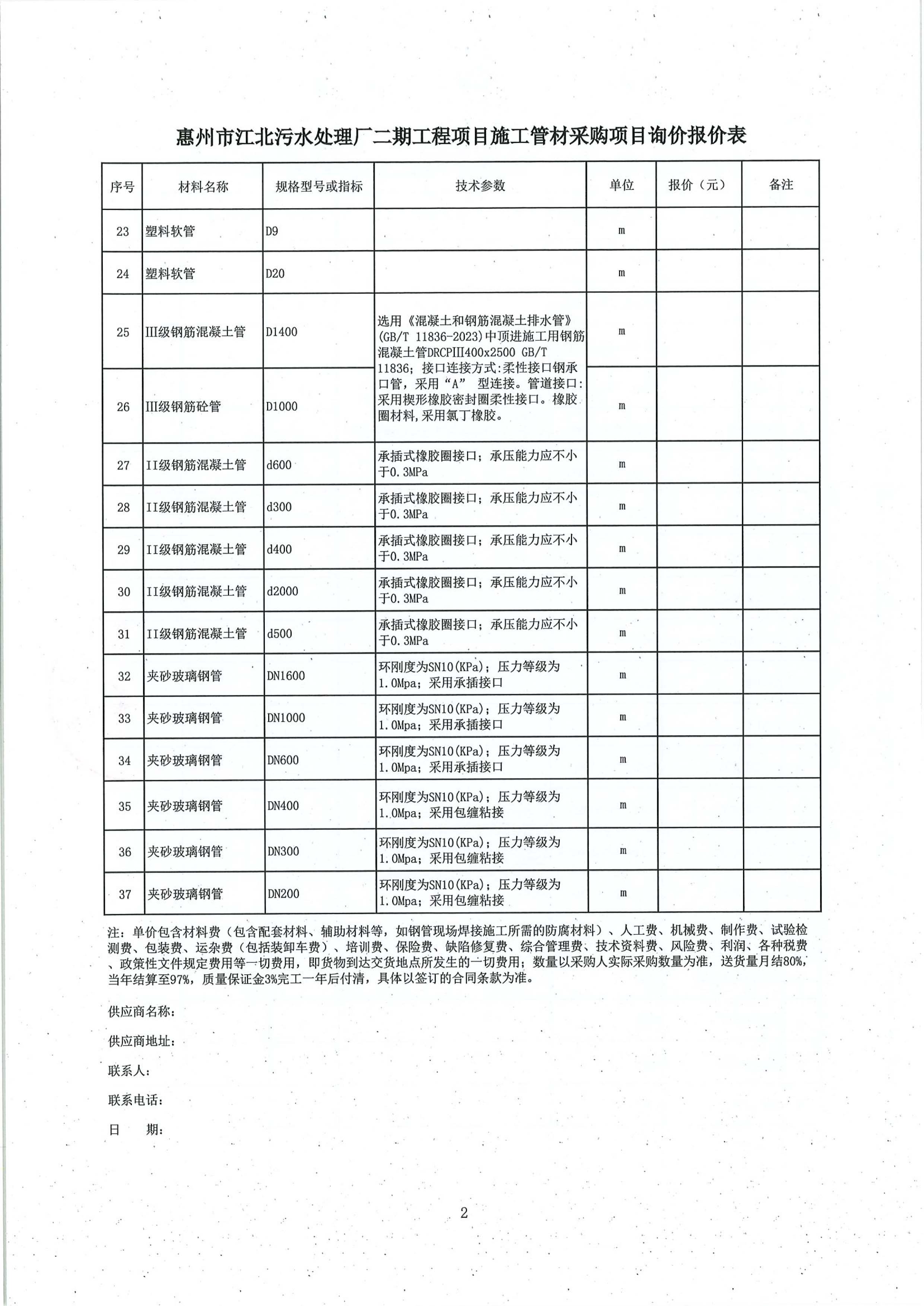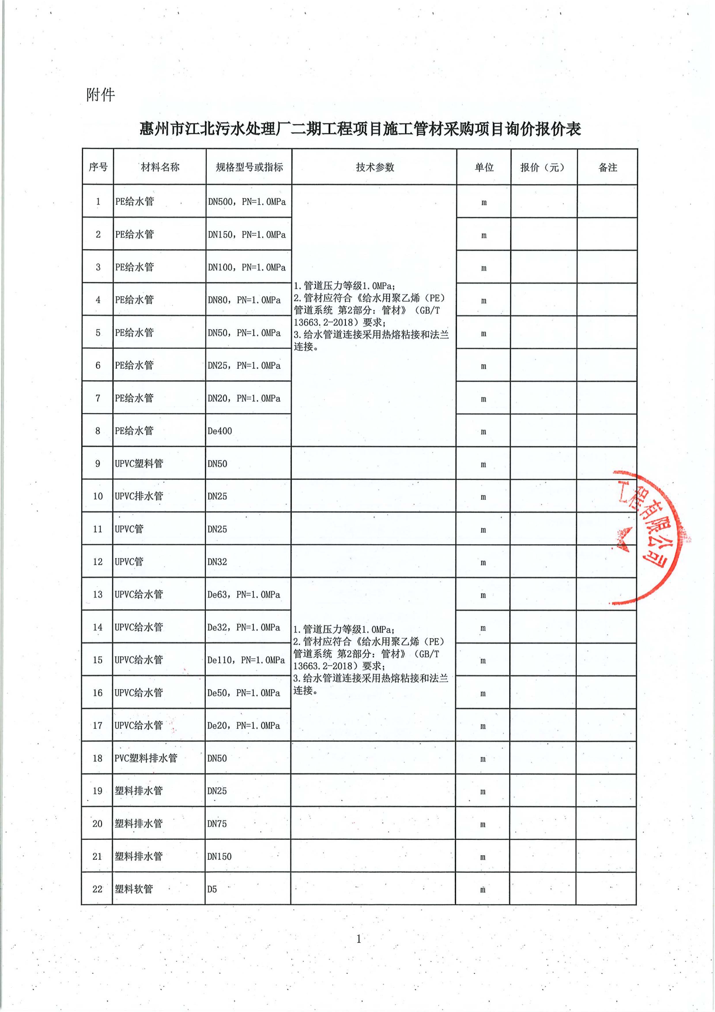 附件:惠州市江北污水處理廠二期工程項(xiàng)目施工管材采購項(xiàng)目詢價(jià)報(bào)價(jià)表