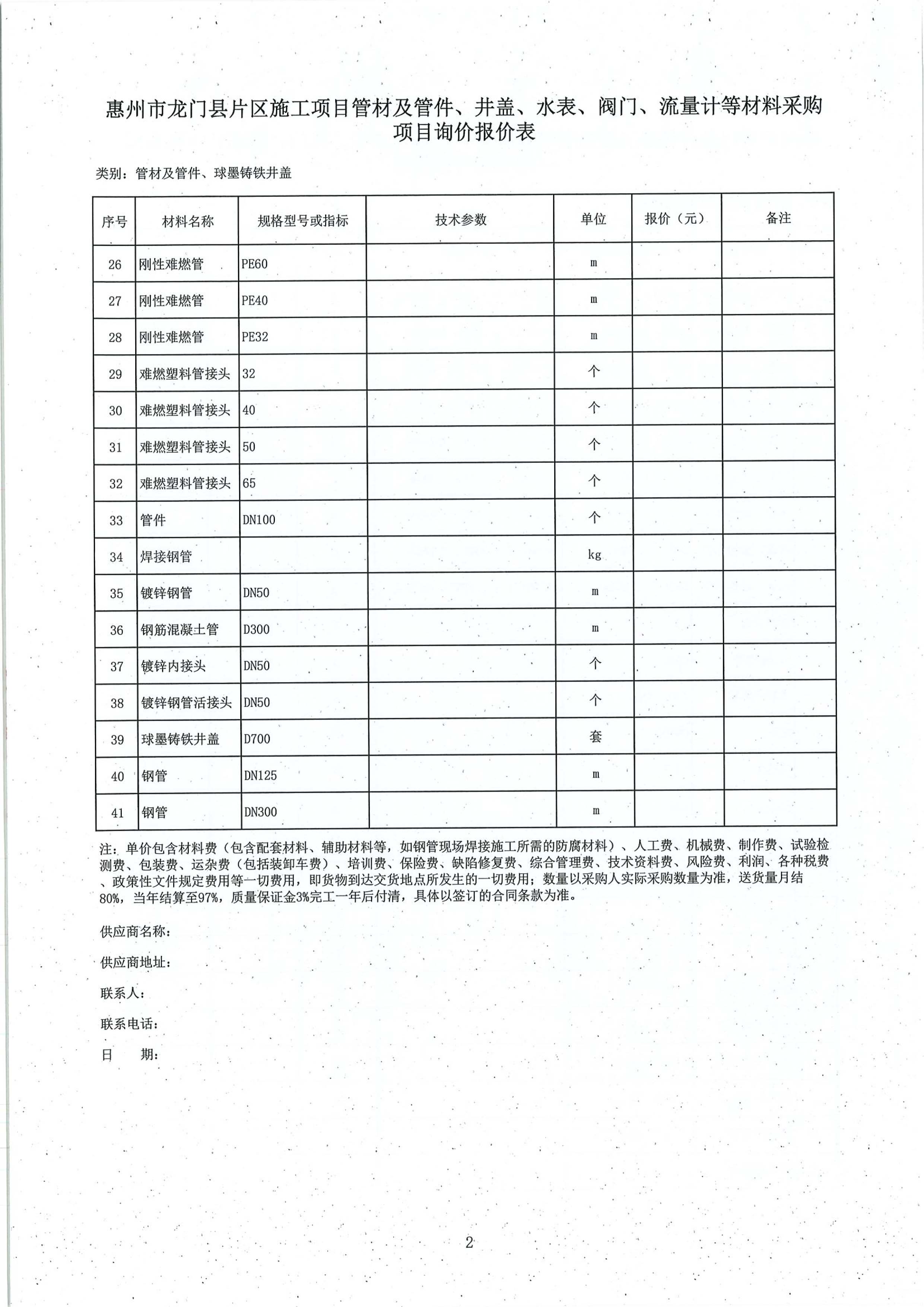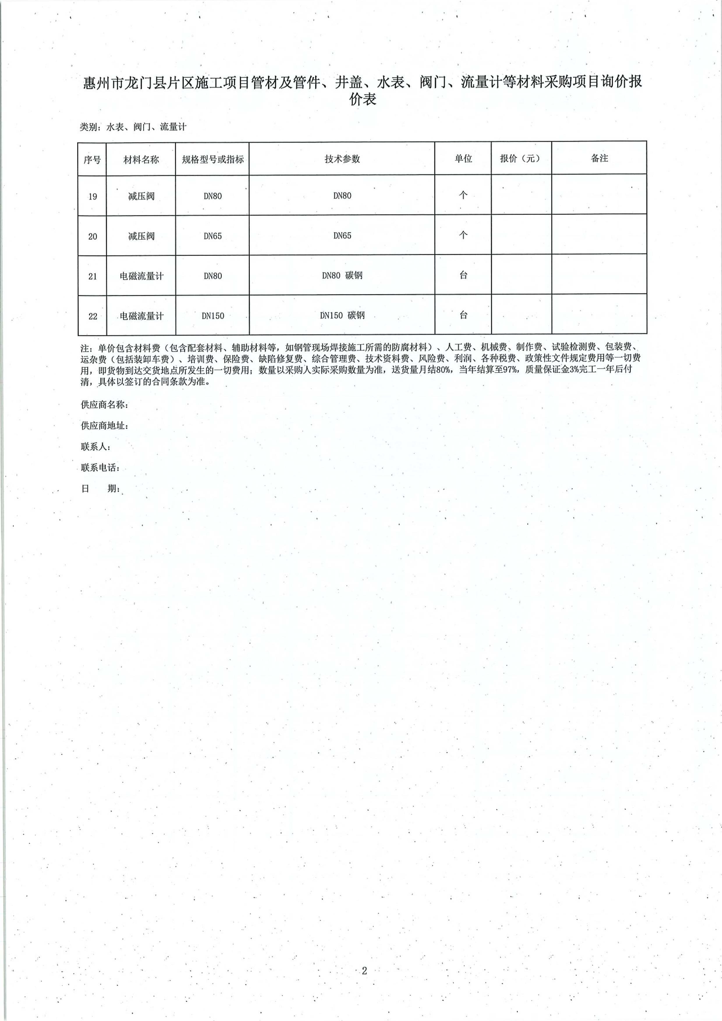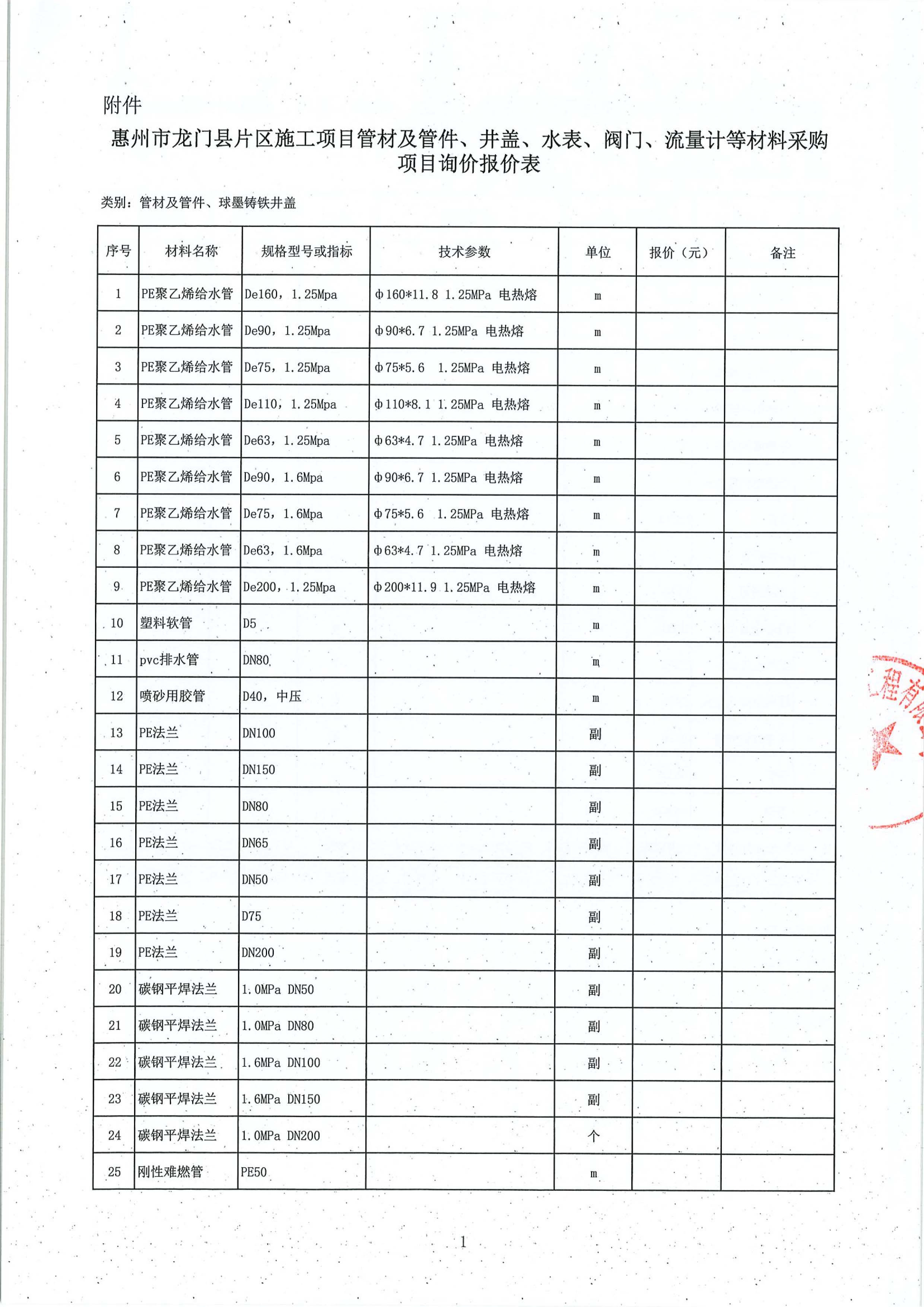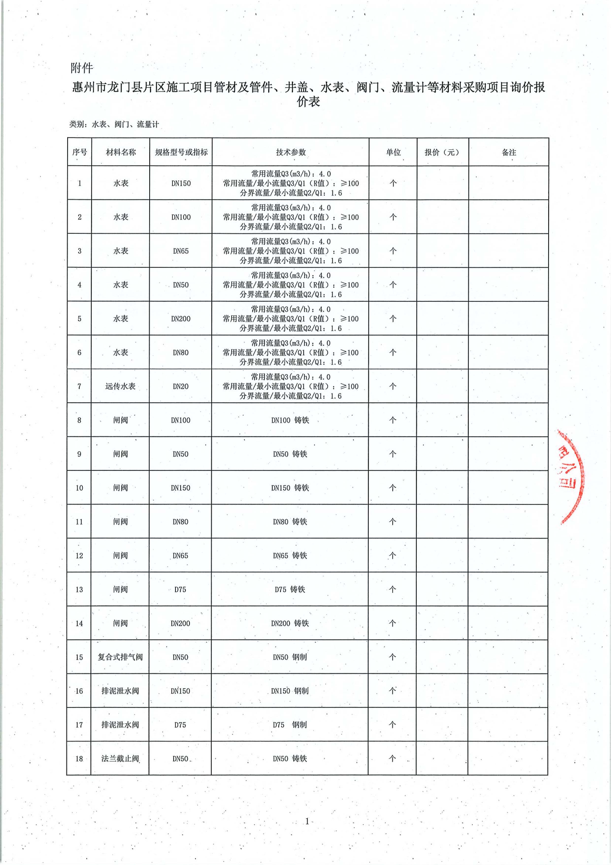 惠州市龍門縣片區(qū)施工項(xiàng)目管材及管件、井蓋、水表、閥門、流量計等材料采購項(xiàng)目詢價公告附件: