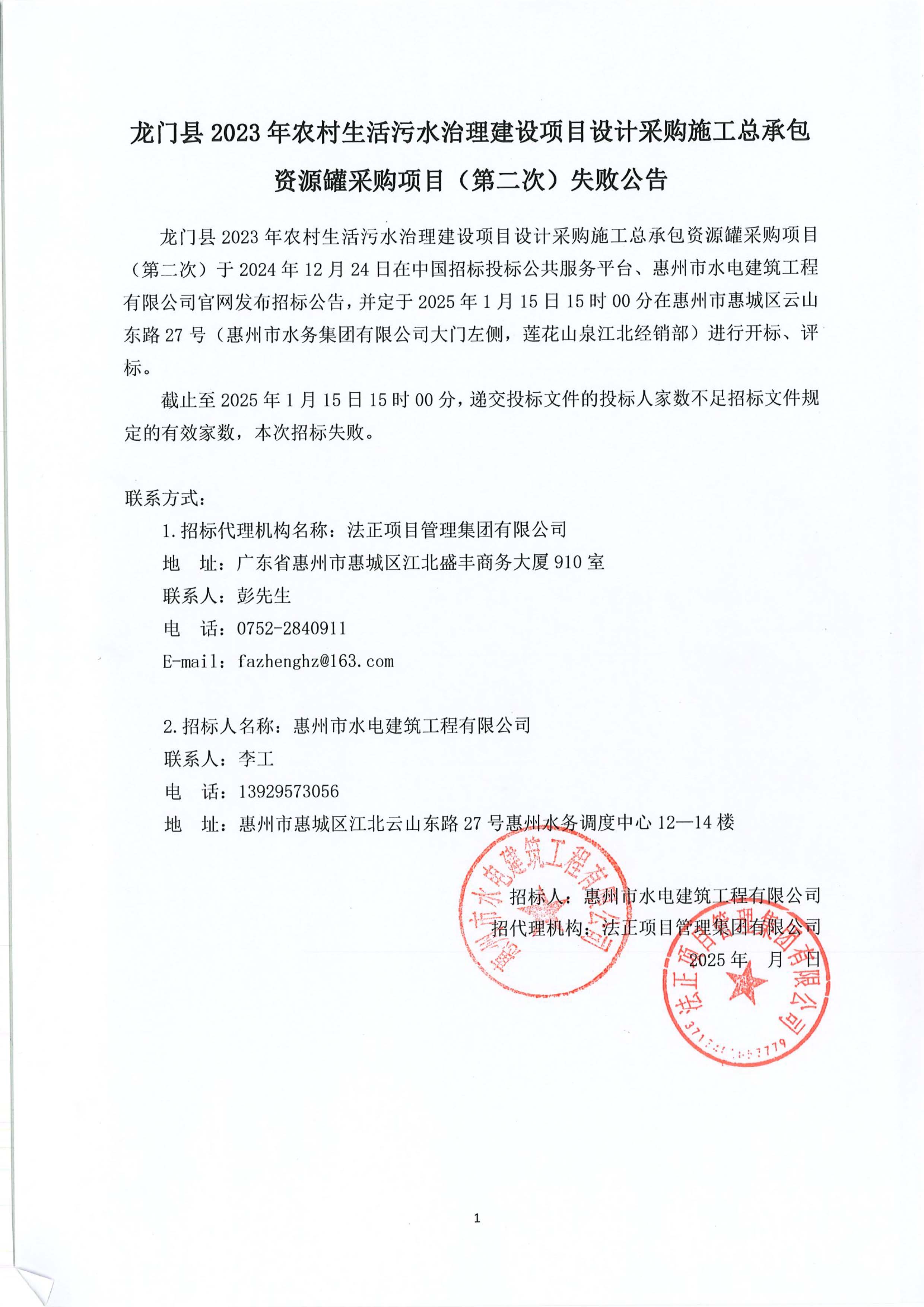 龍門(mén)縣2023年農(nóng)村生活污水治理建設(shè)項(xiàng)目設(shè)計(jì)采購(gòu)施工總承包資源罐采購(gòu)項(xiàng)目(第二次)失敗公告