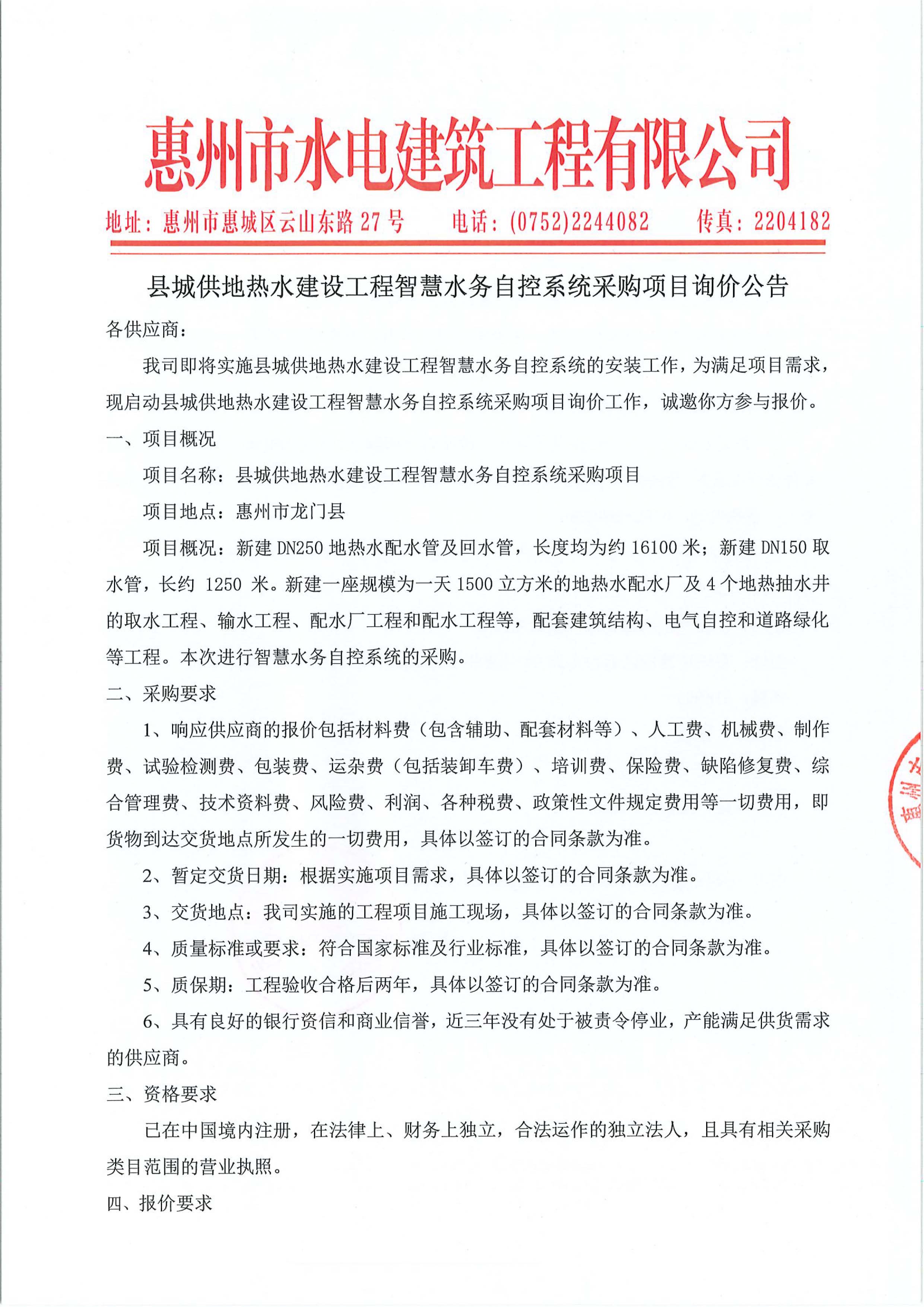 縣城供地熱水建設工程智慧水務自控系統(tǒng)采購項目詢價公告