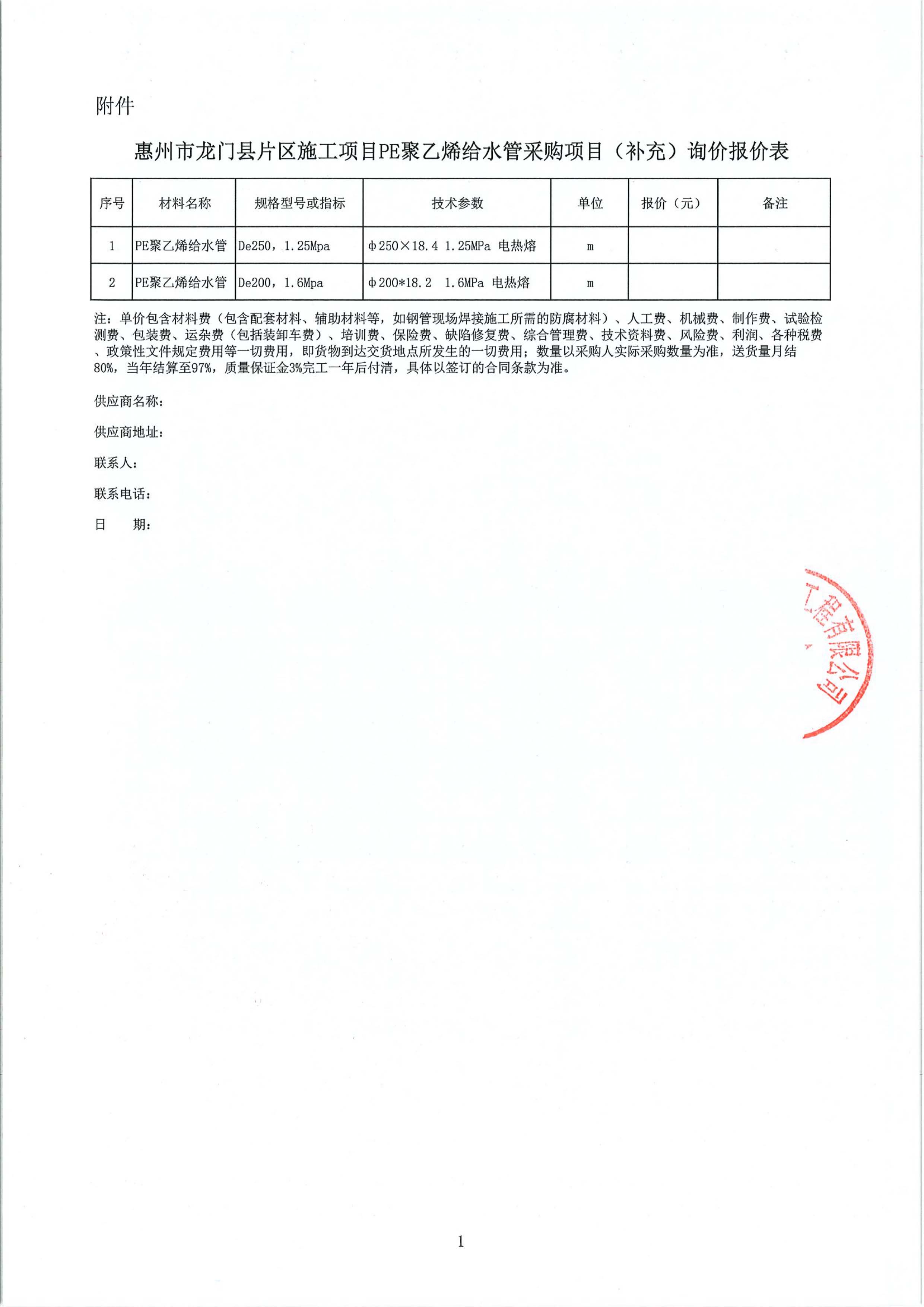 惠州市龍門縣片區(qū)施工項目PE聚乙烯給水管采購項目(補充)詢價公告