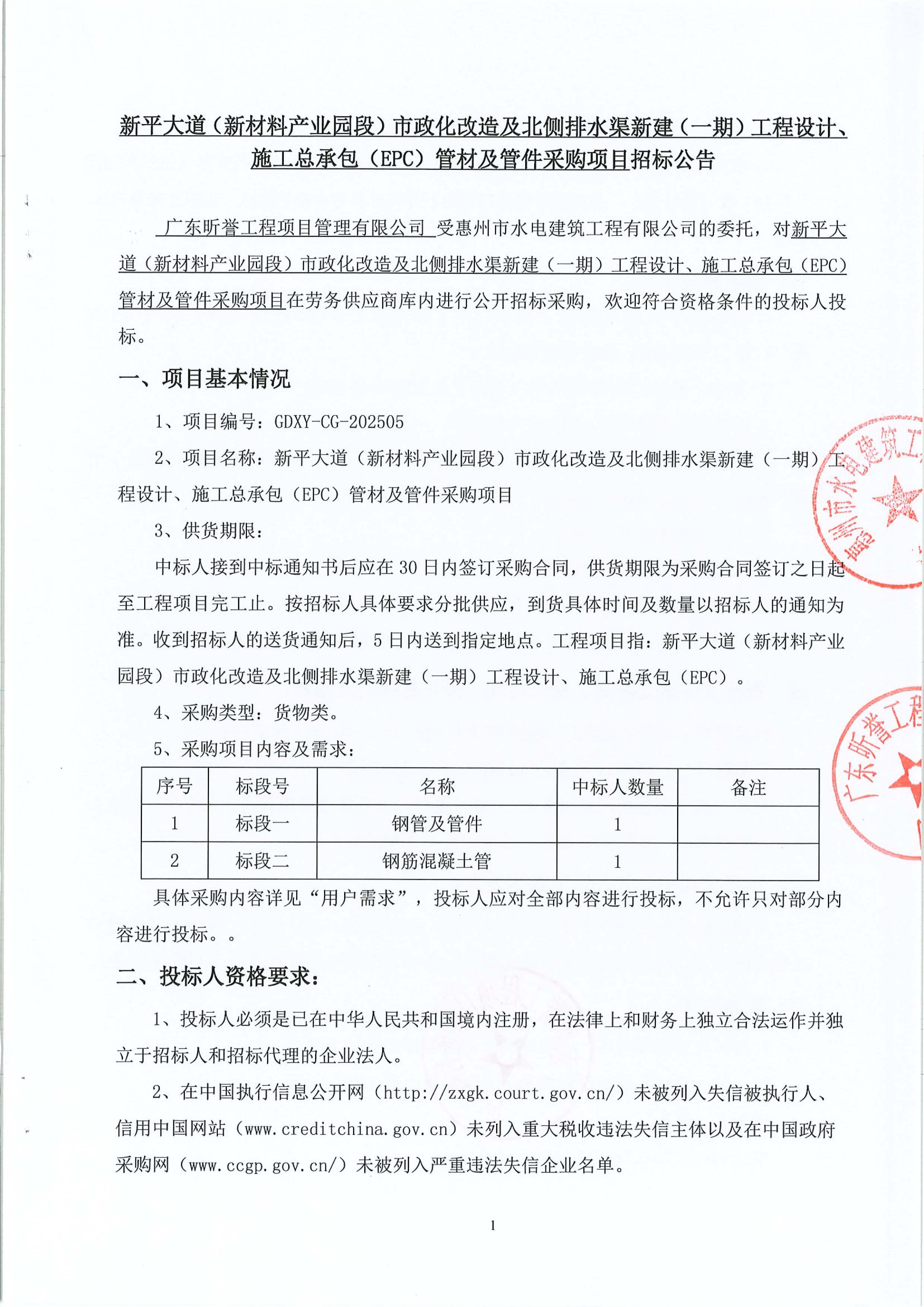 新平大道(新材料產(chǎn)業(yè)園段)市政化改造及北側排水渠新建(一期)工程設計、施工總承包(EPC)管材及管件采購項目招標公告