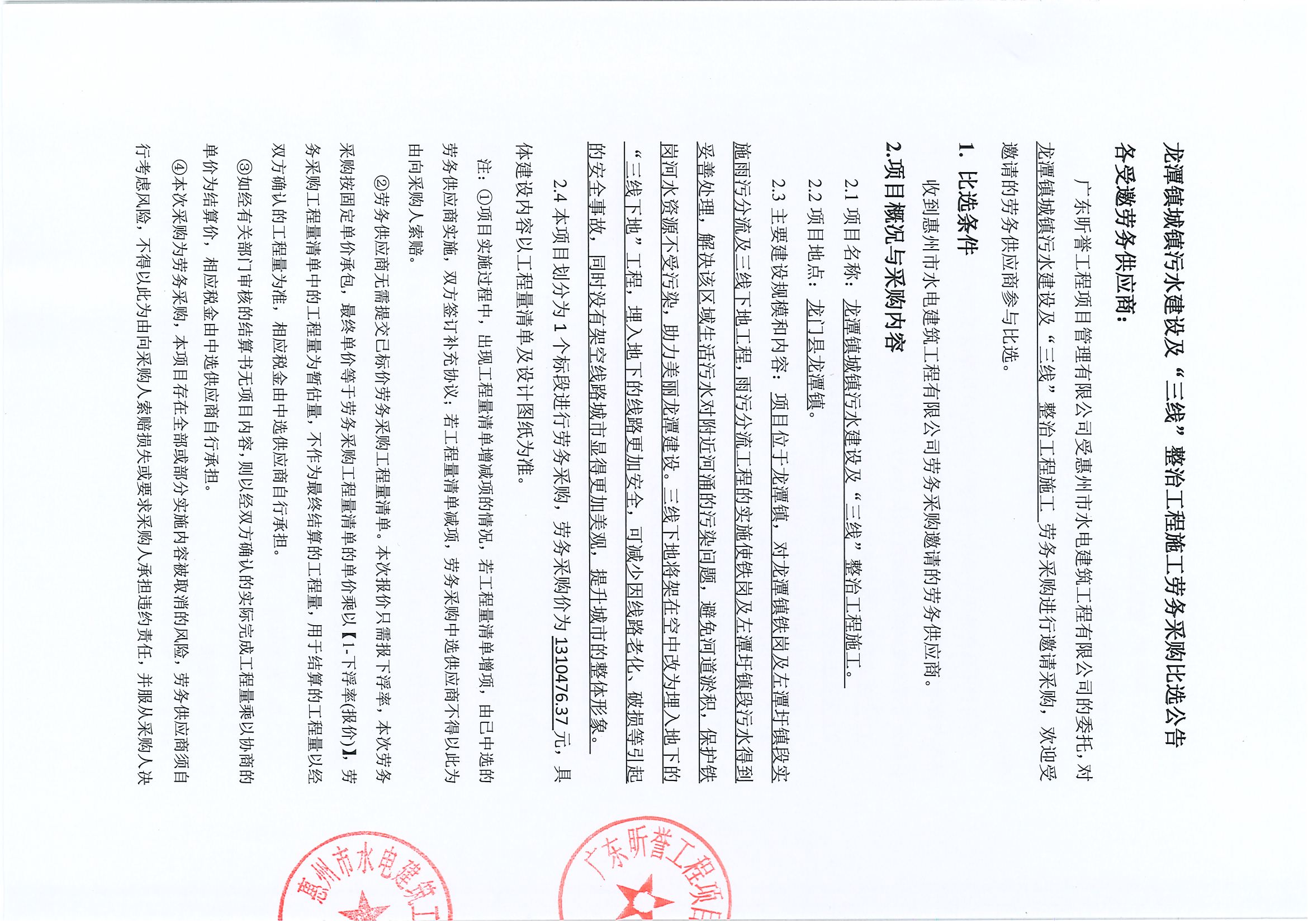 龍?zhí)舵?zhèn)城鎮(zhèn)污水建設(shè)及“三線”整治工程施工勞務(wù)采購比選公告