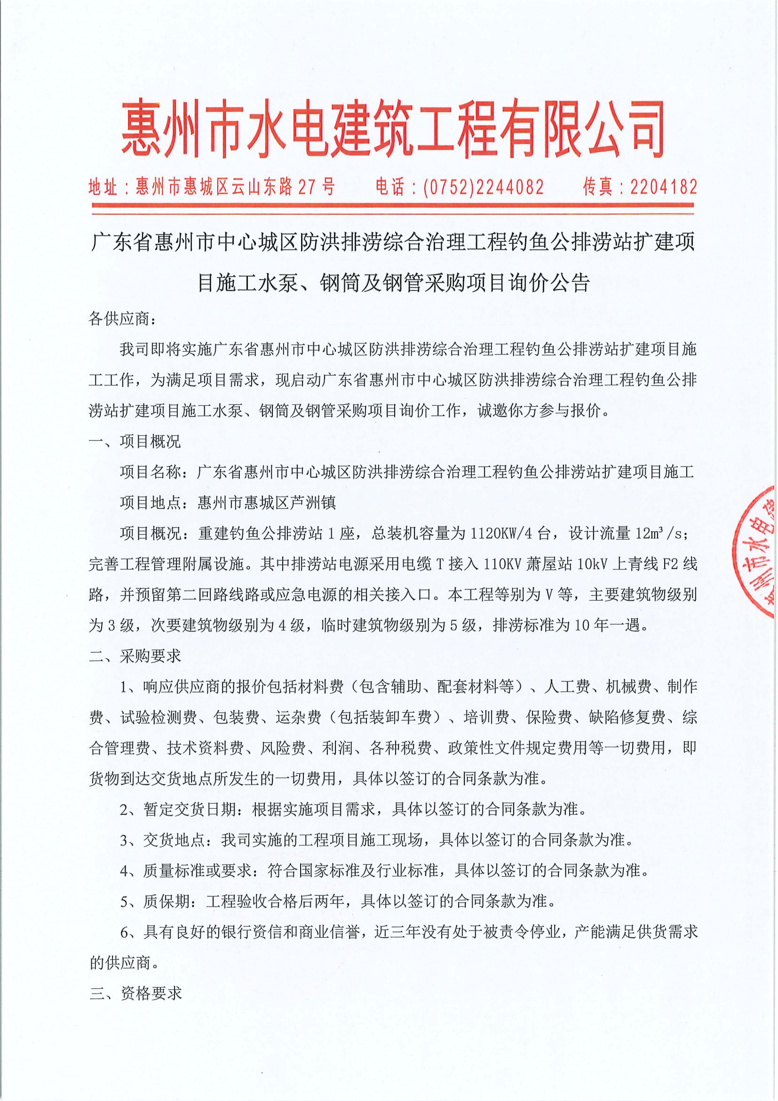 廣東省惠州市中心城區(qū)防洪排澇綜合治理工程釣魚公排澇站擴建項目施工水泵、鋼筒及鋼管采購項目詢價公告