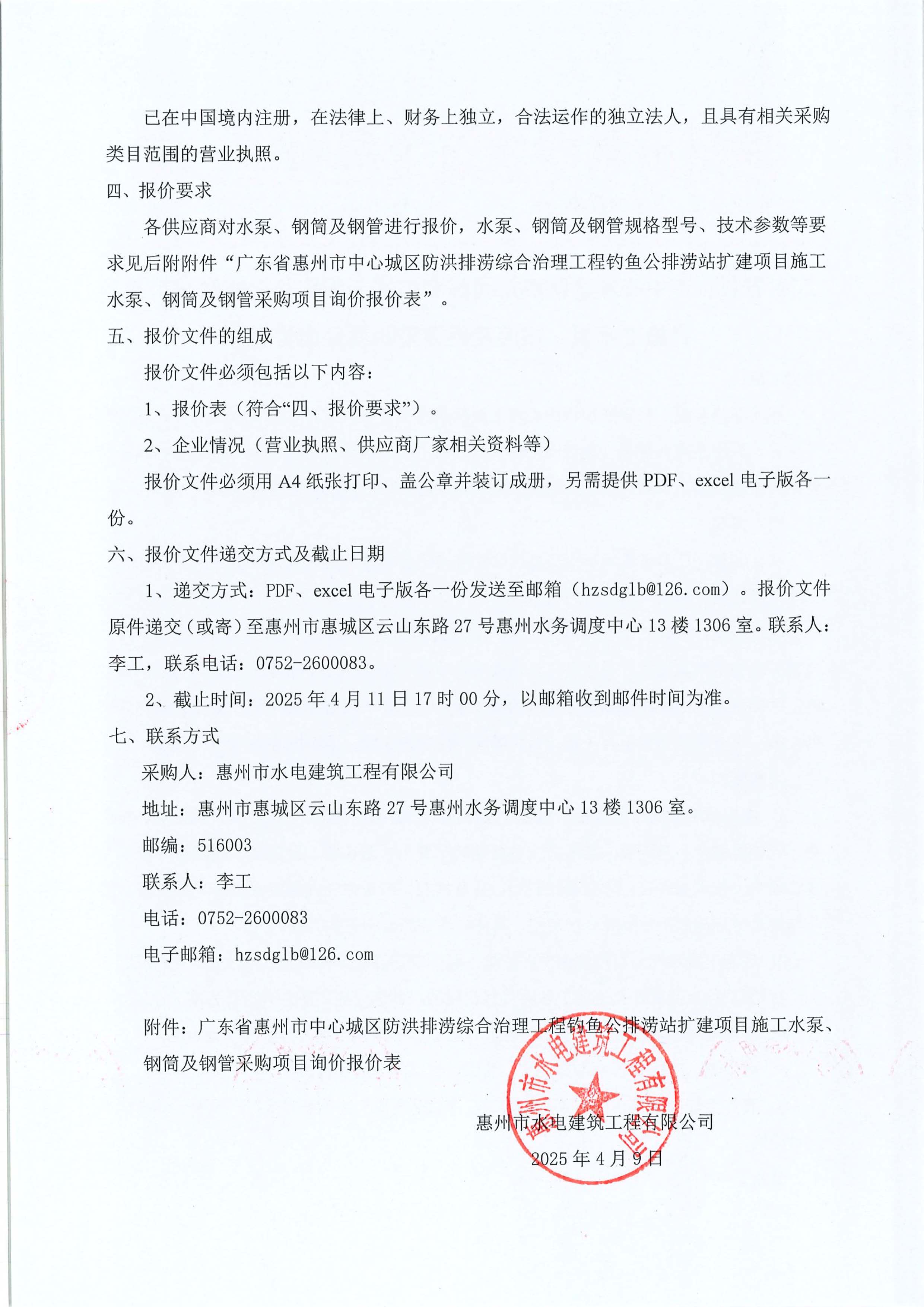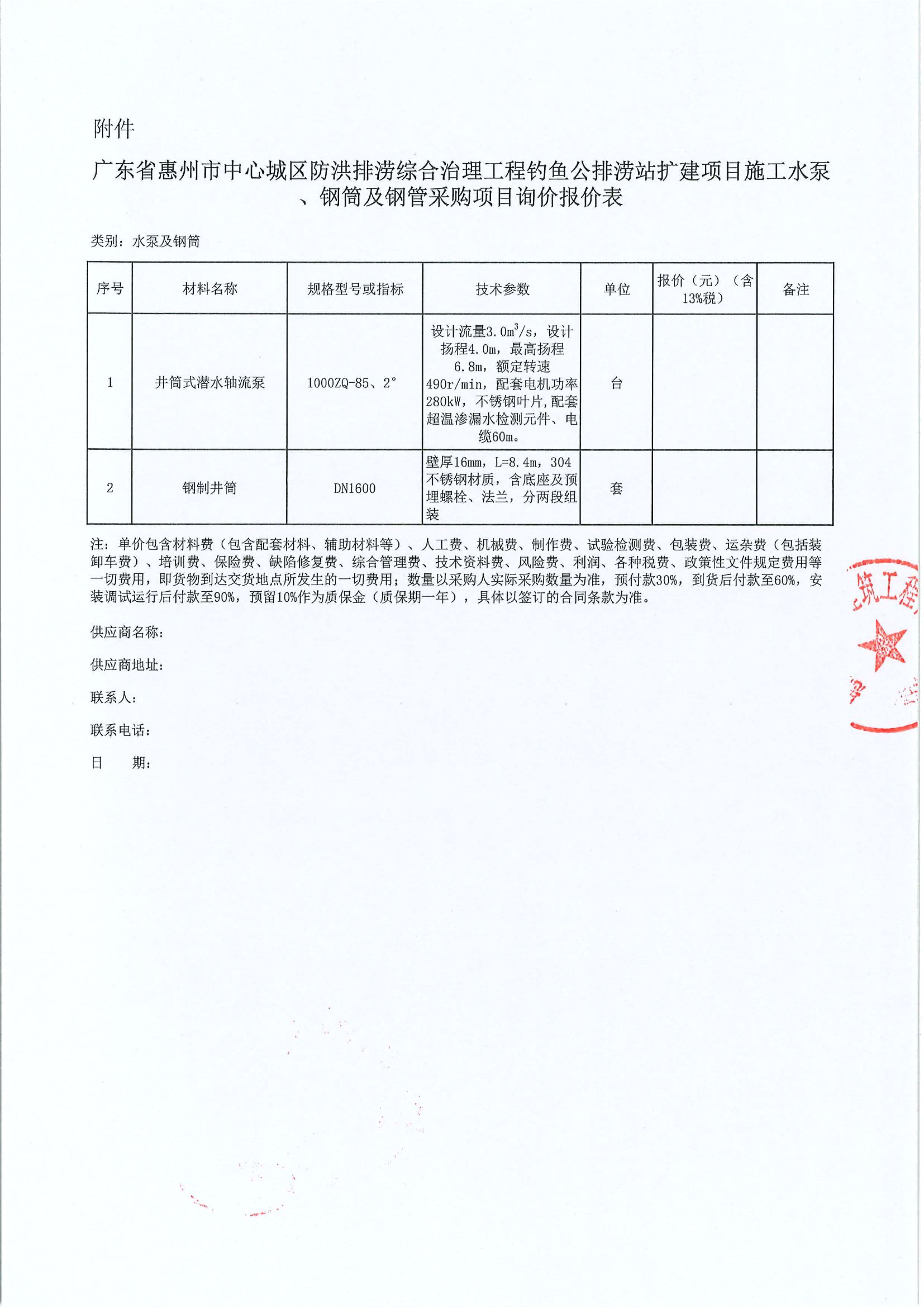 廣東省惠州市中心城區(qū)防洪排澇綜合治理工程釣魚公排澇站擴建項目施工水泵、鋼筒及鋼管采購項目詢價公告附件:
