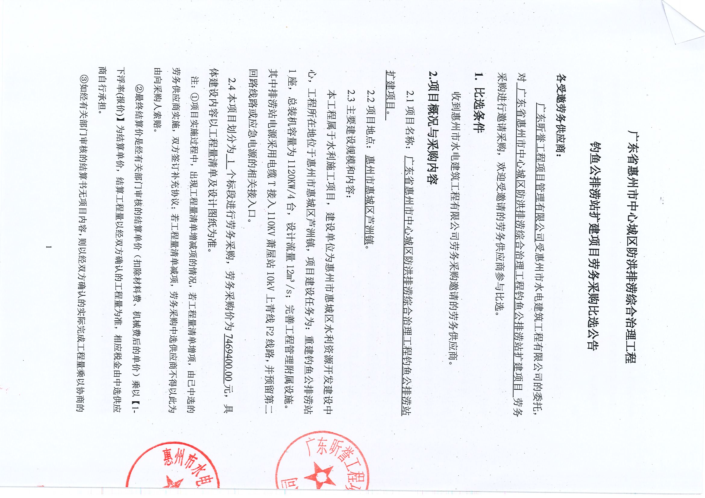 廣東省惠州市中心城區(qū)防洪排澇綜合治理工程釣魚公排澇站擴建項目勞務采購比選公告