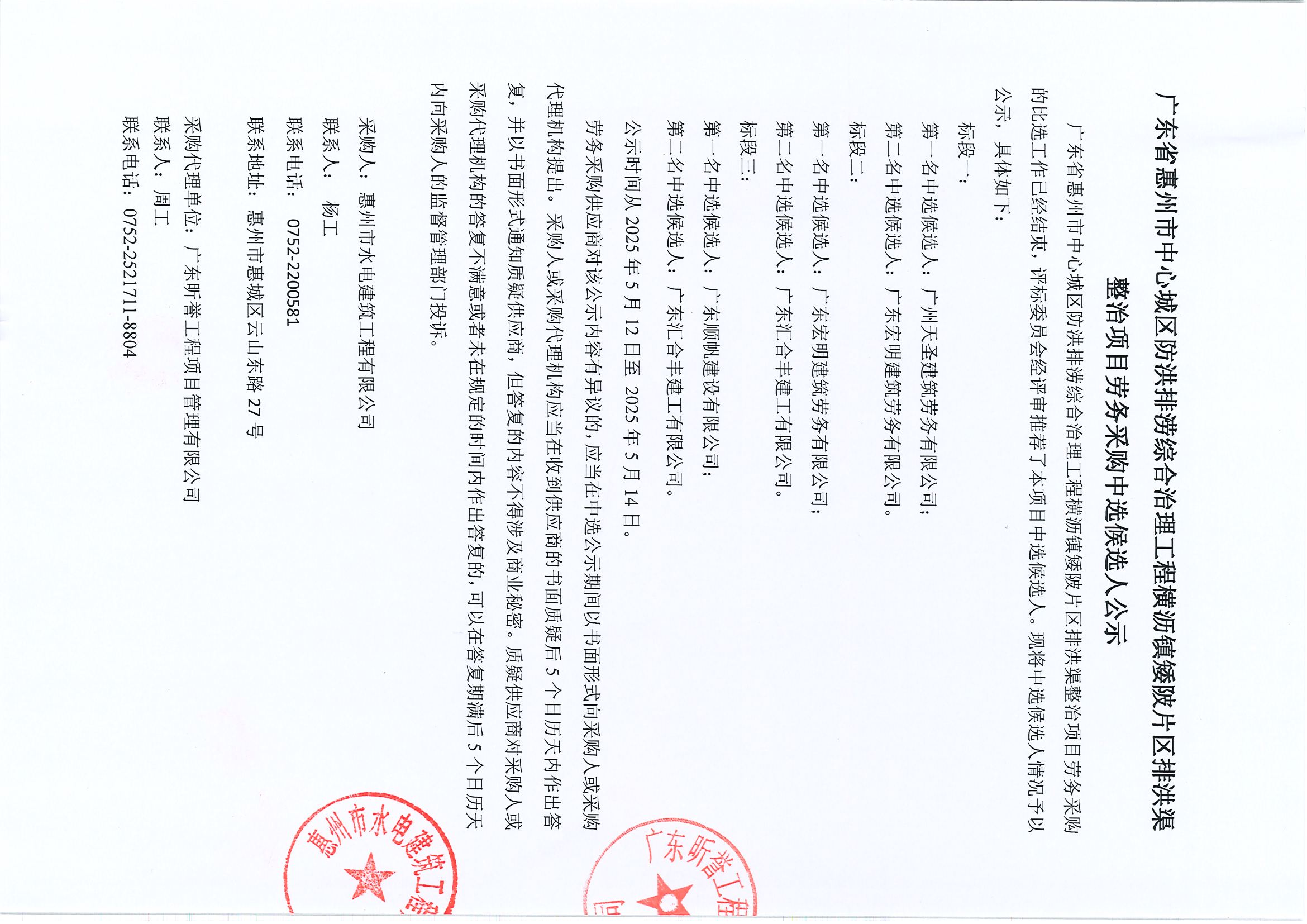 廣東省惠州市中心城區(qū)防洪排澇綜合治理工程橫瀝鎮(zhèn)矮陂片區(qū)排洪渠整治項(xiàng)目勞務(wù)采購中選候選人公示