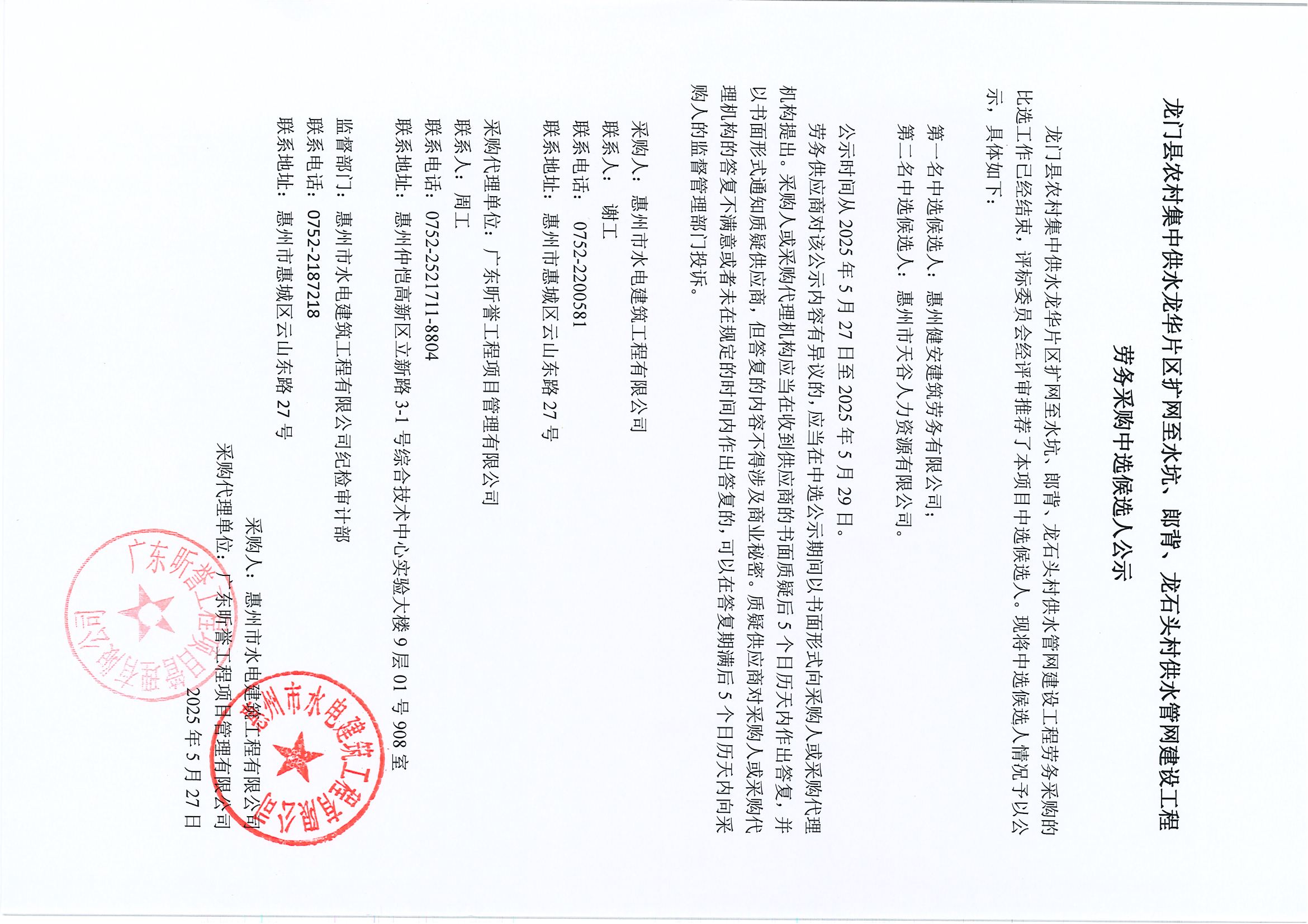 龍門縣農(nóng)村集中供水龍華片區(qū)擴(kuò)網(wǎng)至水坑、郎背、龍石頭村供水管網(wǎng)建設(shè)工程勞務(wù)采購中選候選人公示