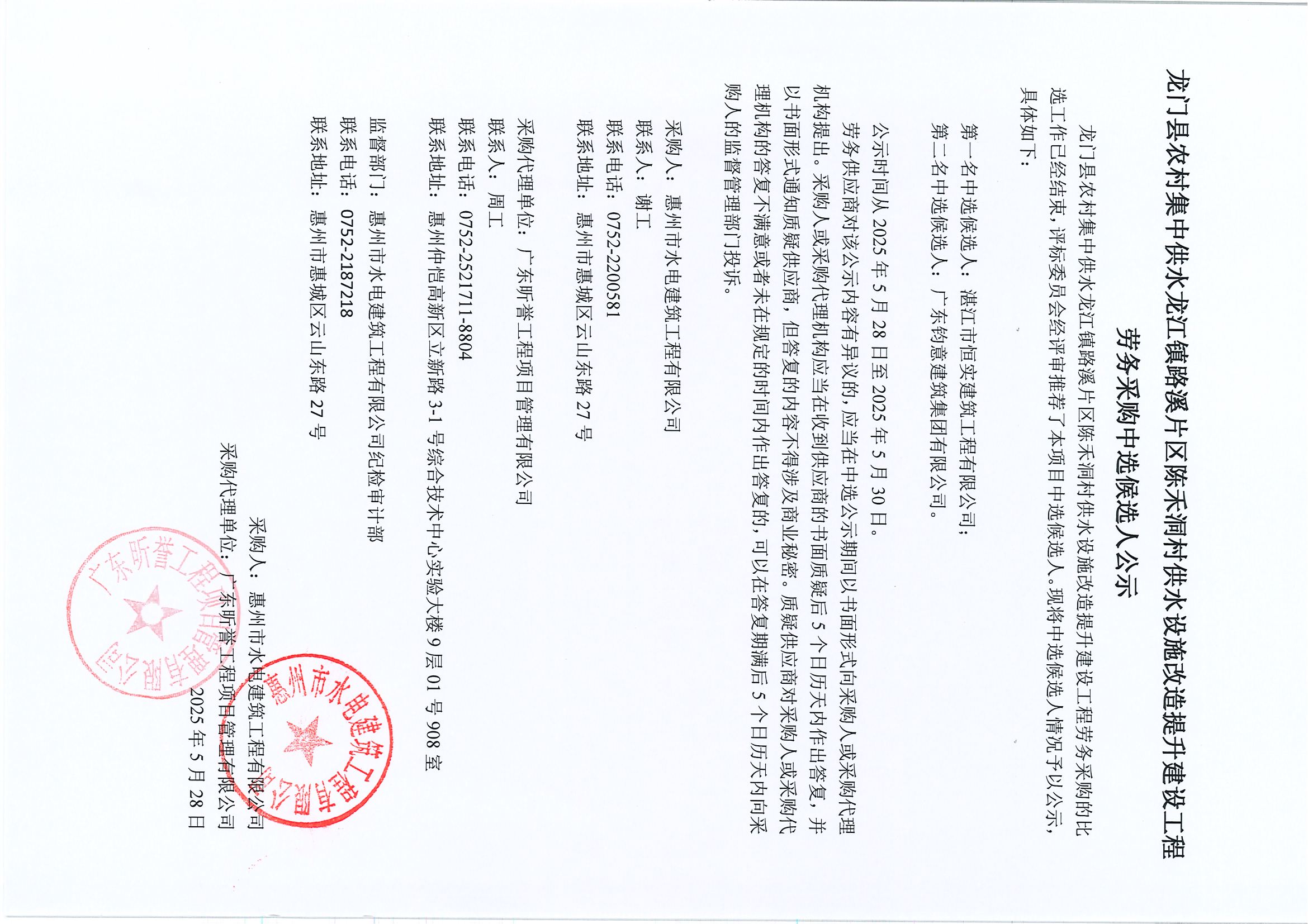 龍門縣農(nóng)村集中供水龍江鎮(zhèn)路溪片區(qū)陳禾洞村供水設(shè)施改造提升建設(shè)工程勞務(wù)采購中選候選人公示