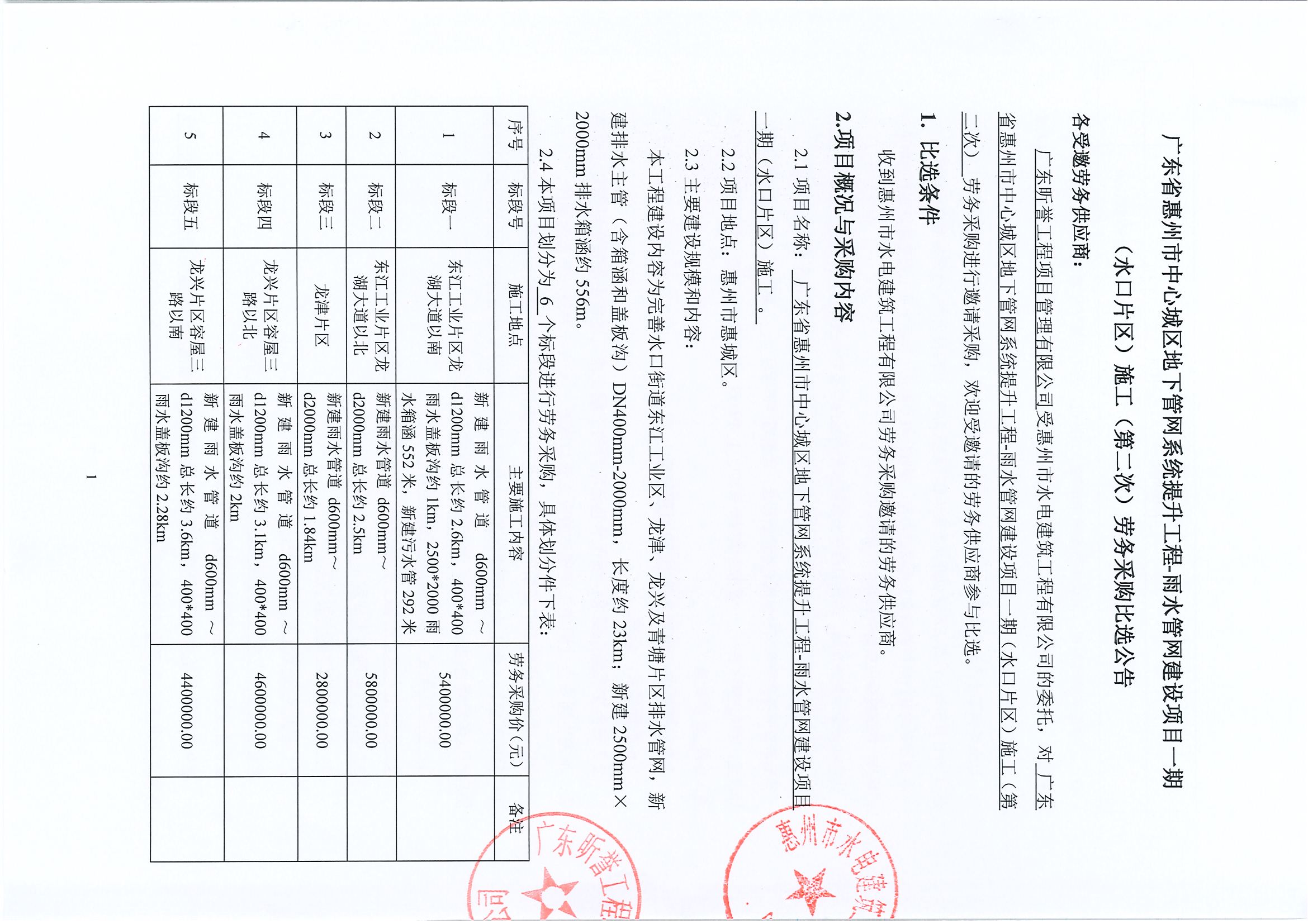 廣東省惠州市中心城區(qū)地下管網(wǎng)系統(tǒng)提升工程-雨水管網(wǎng)建設(shè)項(xiàng)目一期(水口片區(qū))施工(第二次)勞務(wù)采購(gòu)比選公告