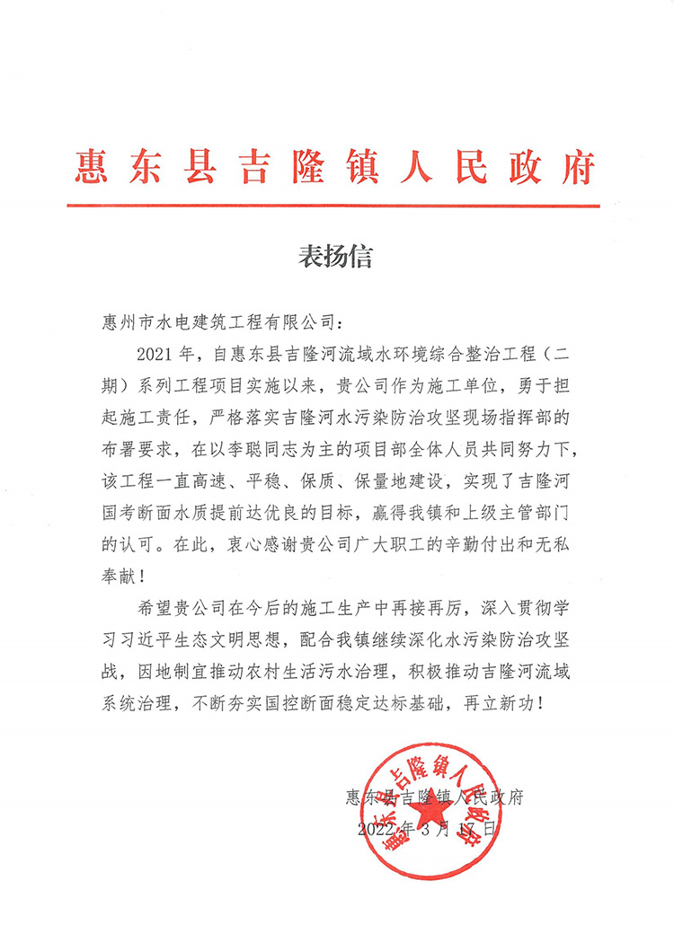 近日,我司從惠東縣吉隆鎮(zhèn)人民政府收到表揚信,對我司在承建的惠東縣吉隆河流域水環(huán)境綜合整治(二期)系列工程施工中勇于擔當作為,嚴格落實部署要求,高速、平穩(wěn)、保質(zhì)、保量完成施工任務(wù),提前實現(xiàn)吉隆河國考斷面水質(zhì)達優(yōu)良目標表示衷心感謝。