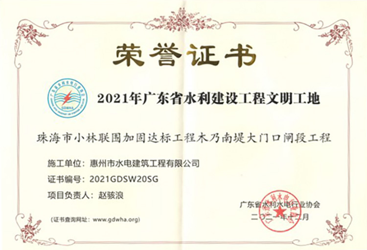 近日,珠海市小林聯(lián)圍加固達(dá)標(biāo)工程木乃南堤大門口閘段工程項(xiàng)目參加2021年度廣東省水利建設(shè)工程文明工地的評(píng)選,經(jīng)過(guò)專家評(píng)審,該項(xiàng)目榮獲“2021年度廣東省水利建設(shè)工程文明工地”榮譽(yù)稱號(hào)。