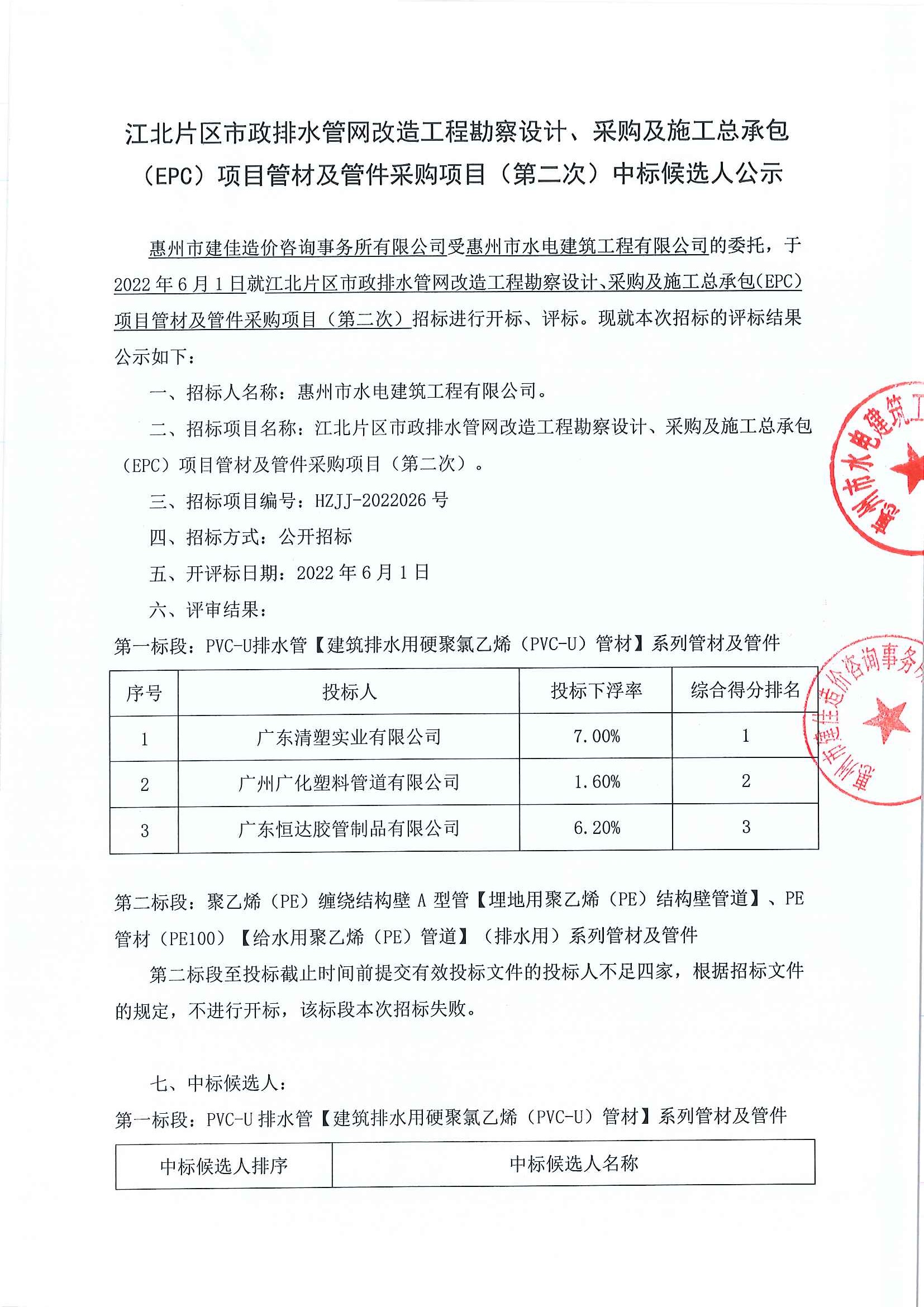 江北片區(qū)市政排水管網(wǎng)改造工程勘察設(shè)計(jì)、采購(gòu)及施工總承包(EPC)項(xiàng)目管材及管件采購(gòu)項(xiàng)目(第二次)中標(biāo)結(jié)果公告