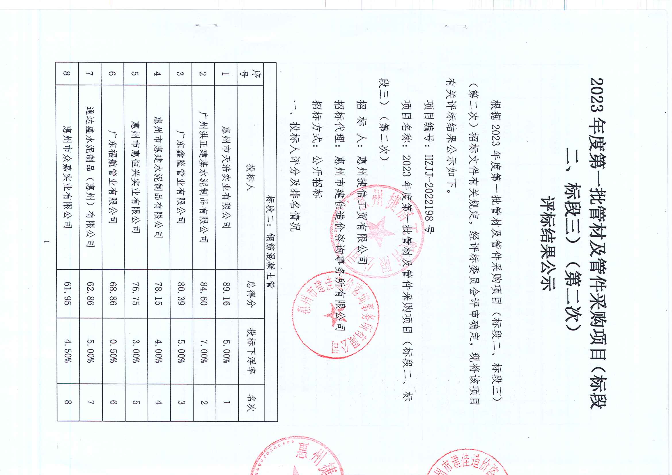 捷信工貿(mào)公司2023年度第一批管材及管件采購(gòu)項(xiàng)目(標(biāo)段二、標(biāo)段三)(第二次)評(píng)標(biāo)結(jié)果公示