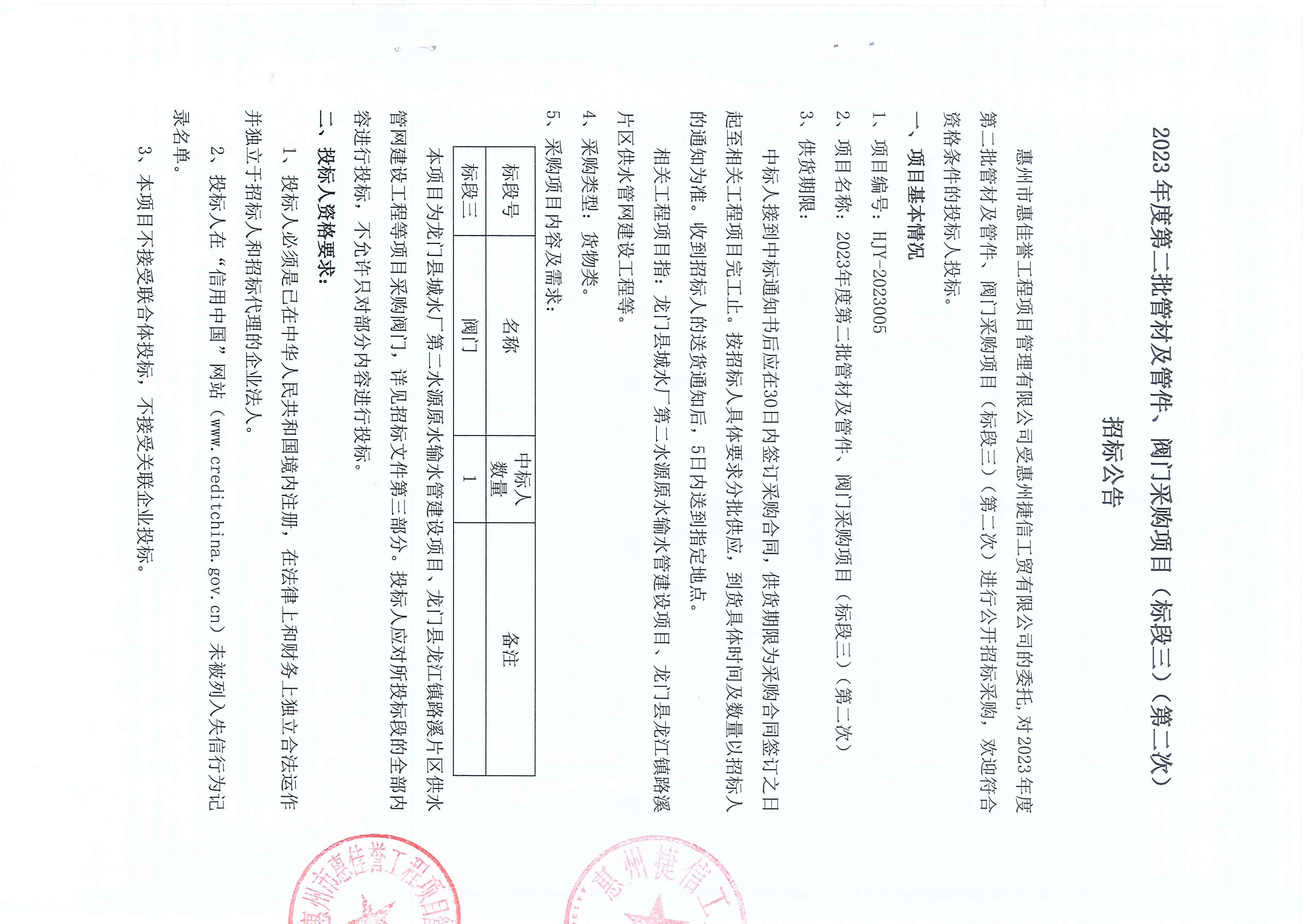 捷信工貿(mào)公司2023年度第二批管材及管件、閥門采購項目(標(biāo)段三)(第二次)招標(biāo)公告