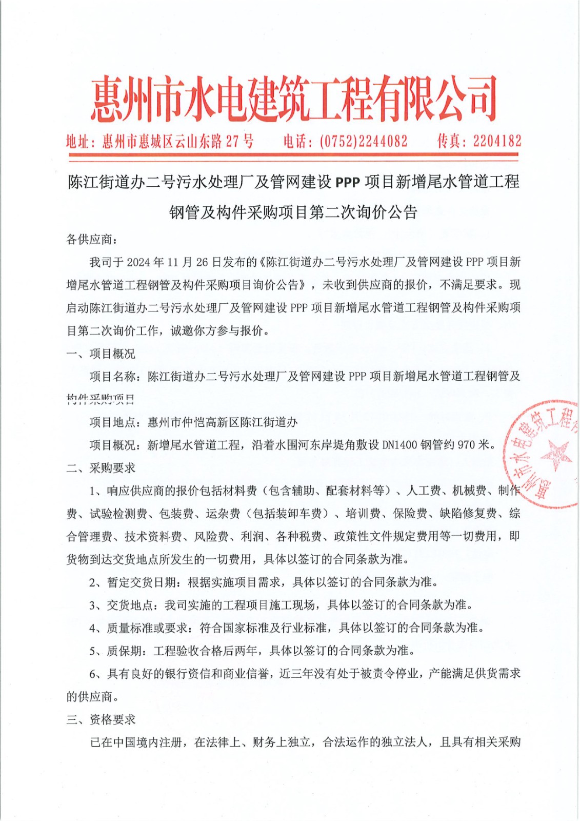 陳江街道辦二號(hào)污水處理廠(chǎng)及管網(wǎng)建設(shè)PPP項(xiàng)目新增尾水管道工程鋼管及構(gòu)件采購(gòu)項(xiàng)目第二次詢(xún)價(jià)公告附件:/upload/202412/09/202412091458001110.xls......