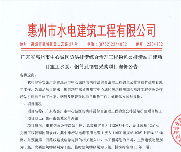 廣東省惠州市中心城區(qū)防洪排澇綜合治理工程釣魚公排澇站擴(kuò)建項(xiàng)目施工水泵、鋼筒及鋼管采購項(xiàng)目詢價(jià)公告......