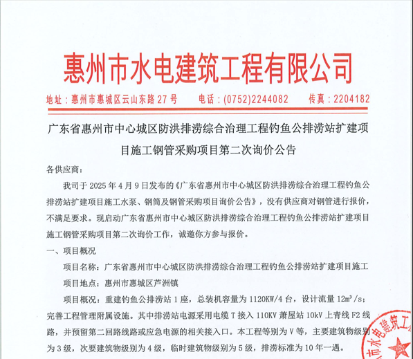 廣東省惠州市中心城區(qū)防洪排澇綜合治理工程釣魚公排澇站擴(kuò)建項(xiàng)目施工鋼管采購項(xiàng)目第二次詢價(jià)公告......