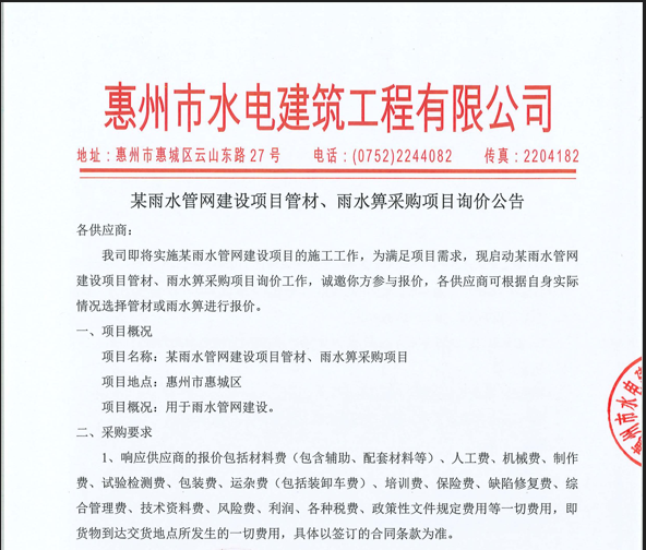 某雨水管網(wǎng)建設(shè)項(xiàng)目管材、雨水箅采購項(xiàng)目詢價(jià)公告......