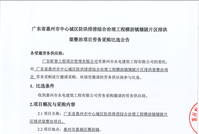 廣東省惠州市中心城區(qū)防洪排澇綜合治理工程橫瀝鎮(zhèn)矮陂片區(qū)排洪渠整治項(xiàng)目勞務(wù)采購比選公告......