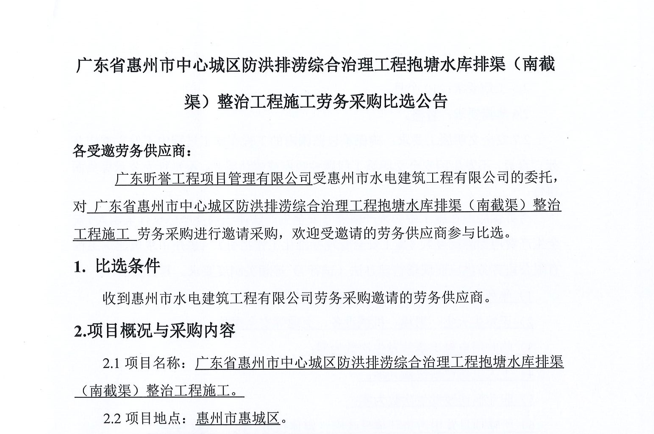 廣東省惠州市中心城區(qū)防洪排澇綜合治理工程抱塘水庫排渠(南截渠)整治工程施工勞務(wù)采購比選公告......