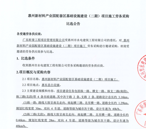 惠州新材料產(chǎn)業(yè)園配套區(qū)基礎(chǔ)設(shè)施建設(shè)(二期)項(xiàng)目施工勞務(wù)采購比選公告......