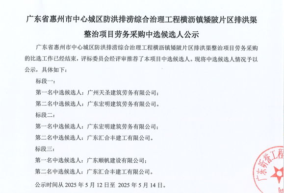 廣東省惠州市中心城區(qū)防洪排澇綜合治理工程橫瀝鎮(zhèn)矮陂片區(qū)排洪渠整治項(xiàng)目勞務(wù)采購中選候選人公示......