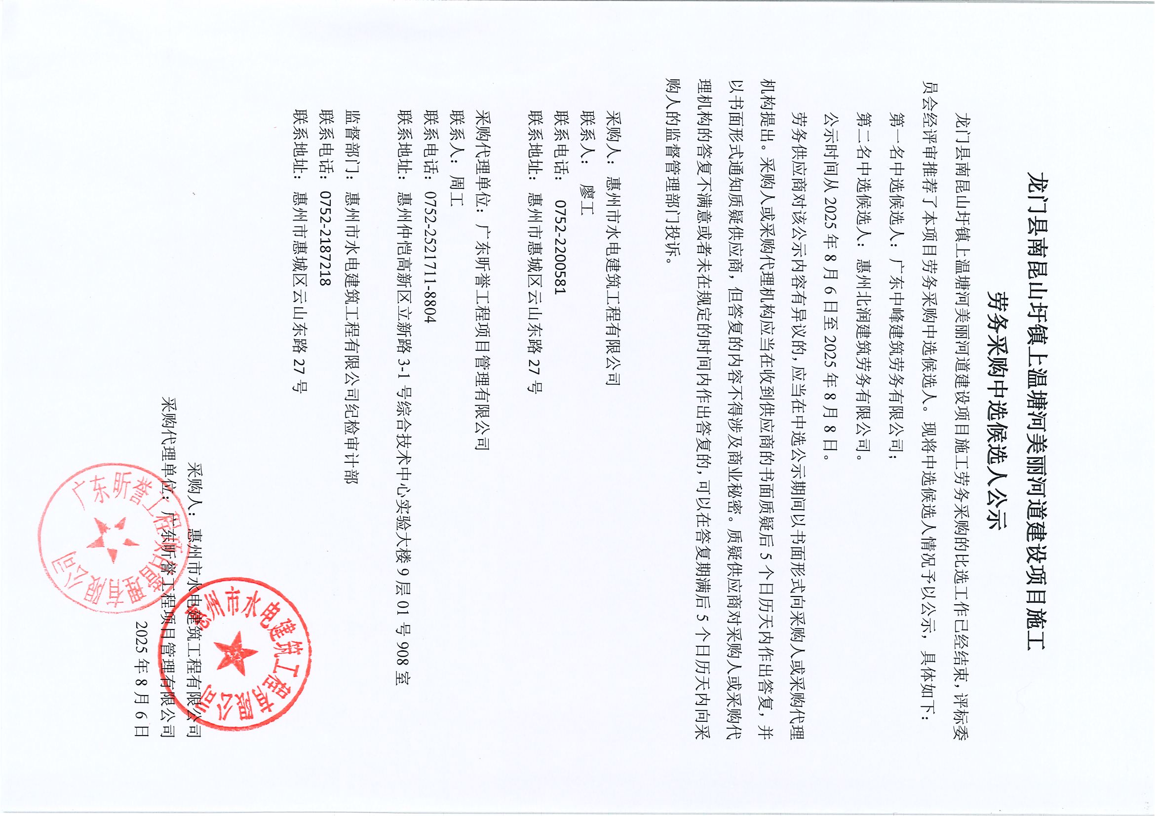 龍門(mén)縣南昆山圩鎮(zhèn)上溫塘河美麗河道建設(shè)項(xiàng)目施工勞務(wù)采購(gòu)中選候選人公示