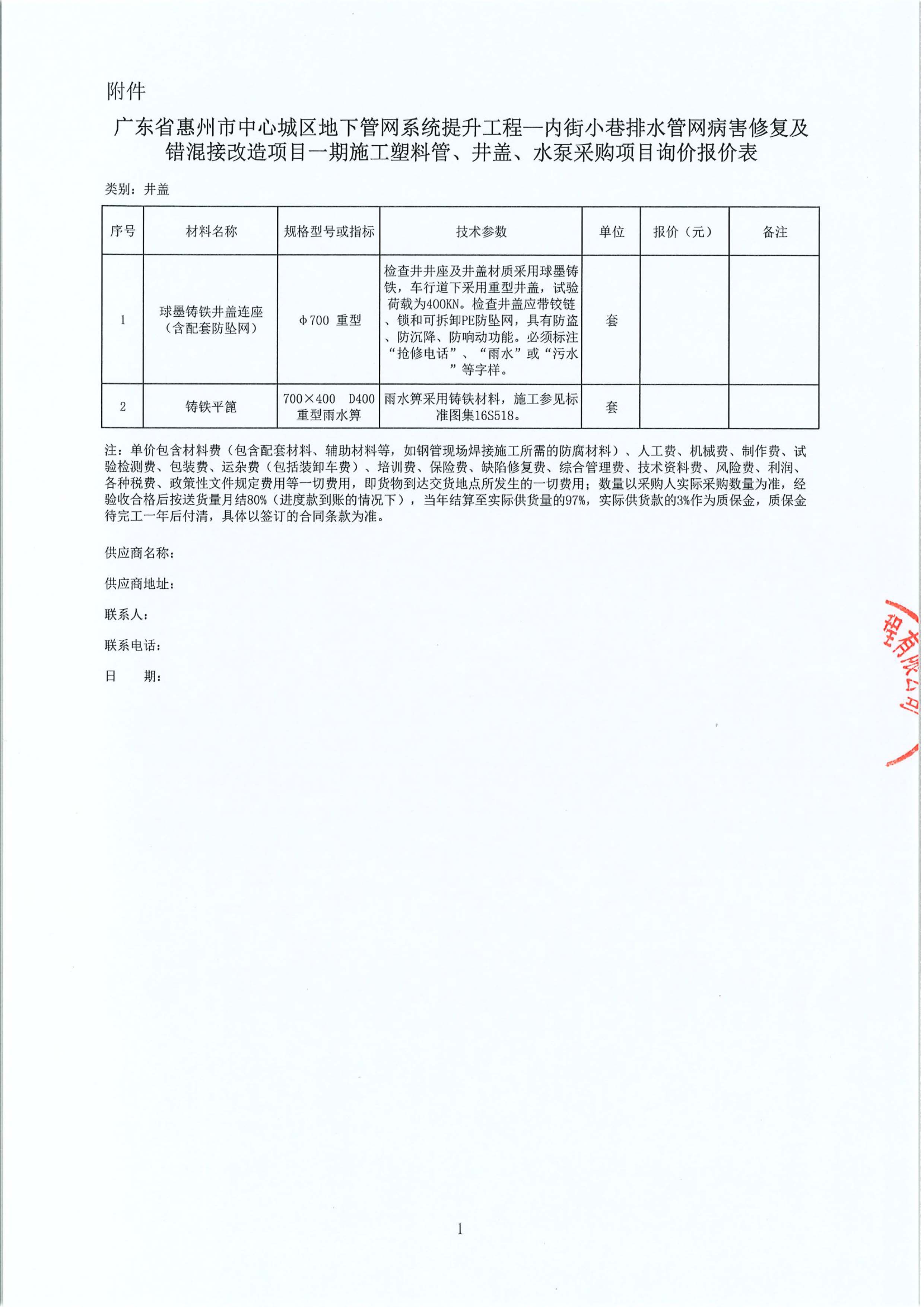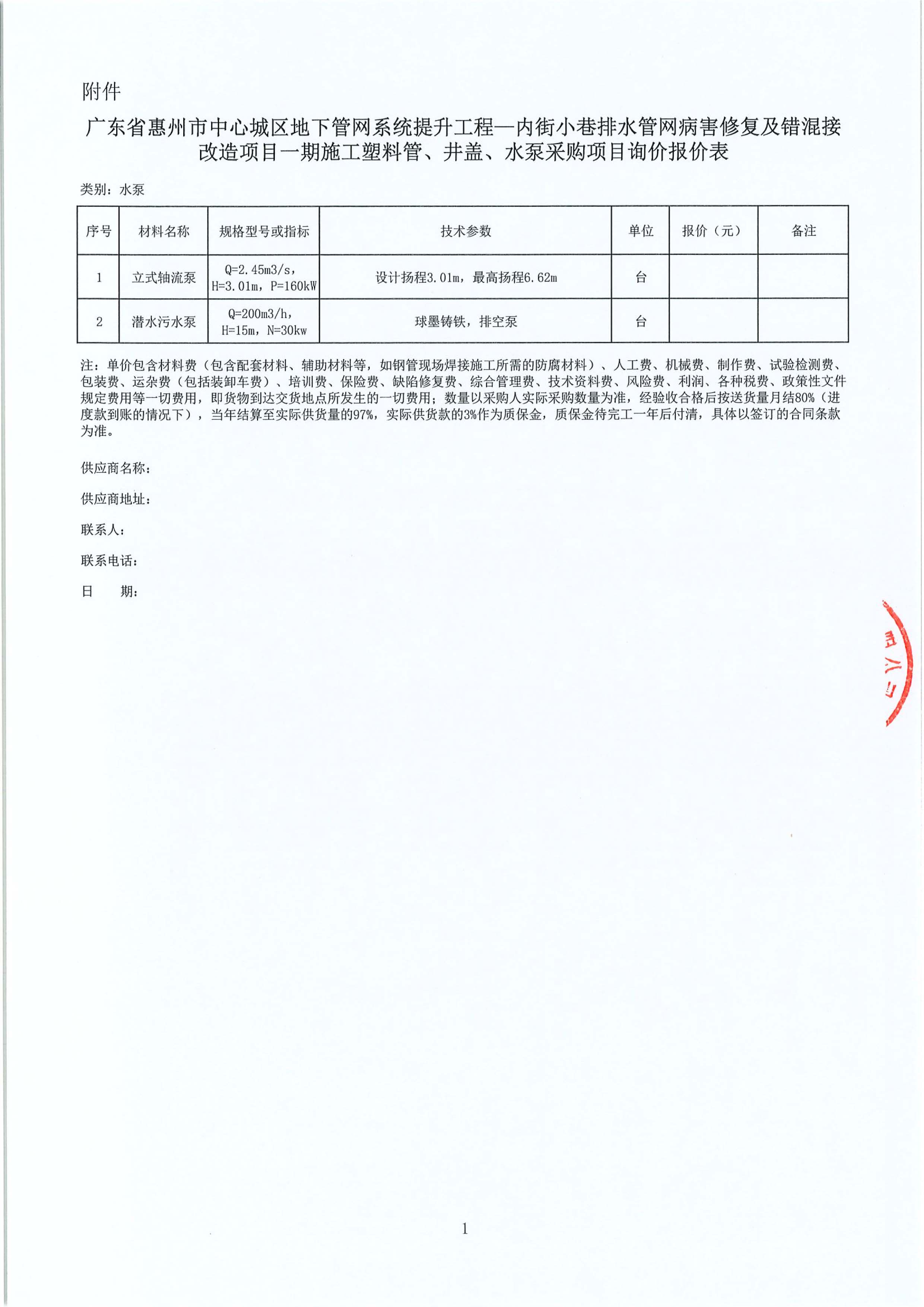 廣東省惠州市中心城區(qū)地下管網系統(tǒng)提升工程—內街小巷排水管網病害修復及錯混接改造項目一期施工塑料管、井蓋、水泵采購項目詢價公告附件: